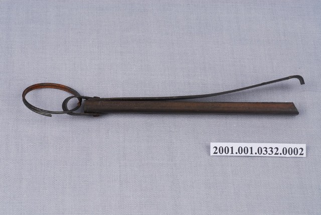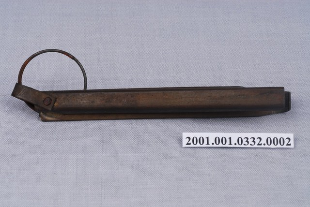 1.本件為紅銅製橫式鎖具之鑰匙,前端呈九十度勾起,原本應呈扁平狀,因變形而呈現弧形狀。2.金屬鎖的大量使用始於東漢,分為簧片構造鎖與文字組合鎖兩大類,常用於鎖門、鎖櫃、鎖箱、…等。簧片構造鎖構造分為鎖樑、鎖栓、彈簧片、鎖梗、鎖體、鑰匙。文字形鑰匙孔,其文字的選擇有使用身分限制,其複雜度是按官職遞增,本件鑰匙用於「凵」字孔。