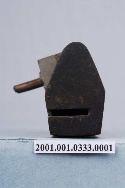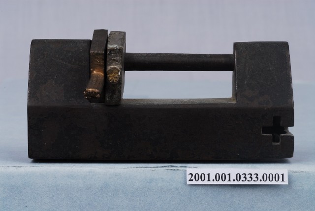 1.紅銅製橫式鎖具,又稱「廣鎖」,鎖頭上部呈三角形,下部呈正方形,外觀有氧化的現象,鎖樑上套有兩個不明部件。本件為需要鑰匙開啟的簧片構造鎖,鑰匙孔開在正面和側面相鄰的兩個面上,屬於「定向鎖」,為必須將鑰匙頭的特定部份以特定的方位與鑰鎖孔的特定位置接觸,始能開鎖。2.金屬鎖的大量使用始於東漢,分為簧片構造鎖與文字組合鎖兩大類,常用於鎖門、鎖櫃、鎖箱、…等。簧片構造鎖構造分為鎖樑、鎖栓、彈簧片、鎖梗、鎖體、鑰匙。
