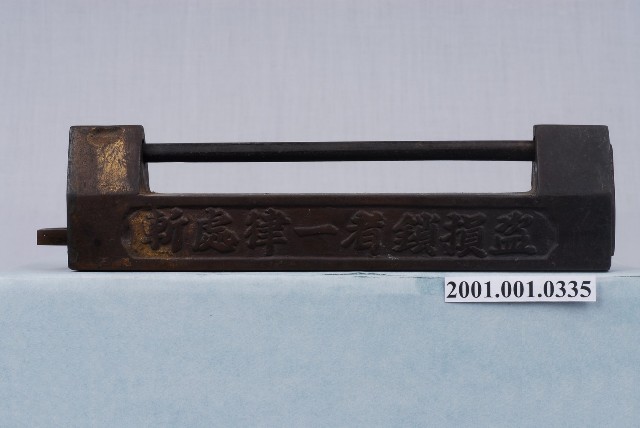 1.紅銅製橫式鎖具,又稱「廣鎖」,鎖頭上部呈三角形,下部呈正方形,側面蝕刻有「同治十年漳州府局」,另一面有「盜損鎖者一律處斬」、「地久」,外觀有氧化的現象。本件為需要鑰匙開啟的簧片構造鎖,鑰匙孔開在側面,形狀為文字形「工字」,本件鑰匙插於鑰匙孔上。2.金屬鎖的大量使用始於東漢,分為簧片構造鎖與文字組合鎖兩大類,常用於鎖門、鎖櫃、鎖箱、…等。簧片構造鎖構造分為鎖樑、鎖栓、彈簧片、鎖梗、鎖體、鑰匙。文字形鑰匙孔,其文字的選擇有使用身分限制,亦有用於祈求健康或婚嫁而使用的文字。