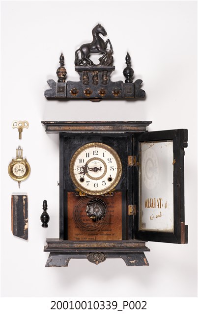1.本項裝飾有馬匹的小型座鐘組可分為座鐘盒體、鐘擺、發條鑰匙、頂蓋裝飾,以及由盒體脫落的裝飾木構件與底座側邊構件共6部件。傳統的座鐘主要放置於櫃體或桌面,運作模式多以發條上鍊做為時鐘的動力來源,透過機芯下方左右擺動的擺錘計算時間。2.臺灣在日本統治後,總督府開始推動民眾養成時間觀念,因此促進時鐘的普及性。日治時期的掛鐘多以木材製作盒體,可分為全部日本進口,以及由日本進口機芯後,於臺灣組裝兩大類。製作精美的座鐘除了報時功能外,也具有美化家內或公共場所的裝飾用途。