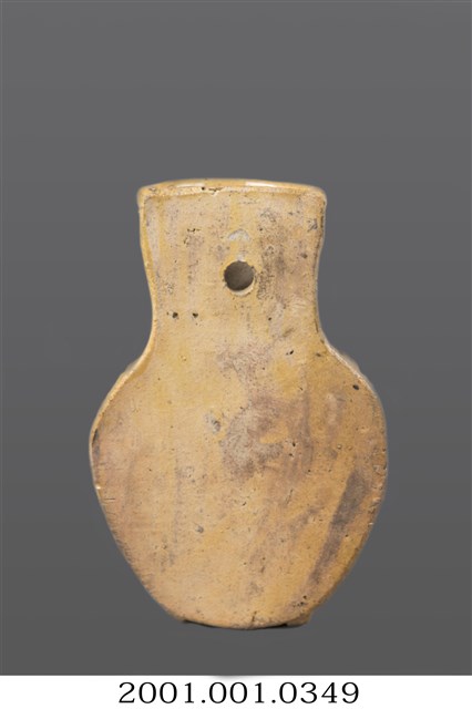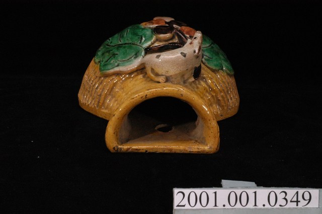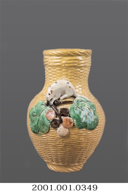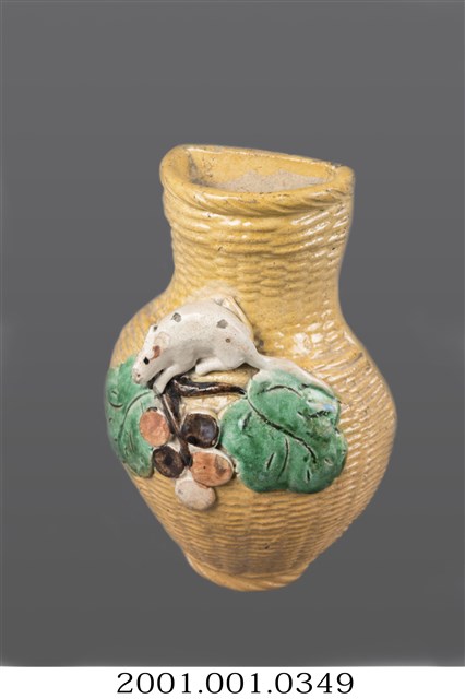 1.本件貼花鼠戲葡萄壁瓶長12.7公分,寬19.5公分,高6.8公分,以陶土燒製而成,器表施以淺褐色釉料,表面仿製竹編器紋路。器身正面以貼花技法裝飾有浮雕彩繪葡萄,以及立體白色老鼠,鼠身釉料因燒製溫度造成釉面收縮,而形成冰裂紋開片。「老鼠」與「葡萄」均帶有多產,結實纍纍的象徵,因此具有多子多孫,綿延不斷的吉祥意涵。壁瓶外型為剖半花瓶,背面為平直壁掛板,於接近瓶口處帶有壁掛孔。花瓶呈現長直口略帶厚唇,束頸廣腹,於下段逐漸收斂,續接圓形圈足。該壁瓶其器型、製作與裝飾方式皆與2001.001.0350相同,應為2件成對之藏品。2.壁瓶又稱轎瓶、半瓶、壁花插,為明清開始流行的裝飾品。原為達官貴人使用,因應轎內空間較為狹小,而出現剖半樣式之裝飾品,後來廣泛用於居家裝飾,可懸掛於牆面或床柱等。