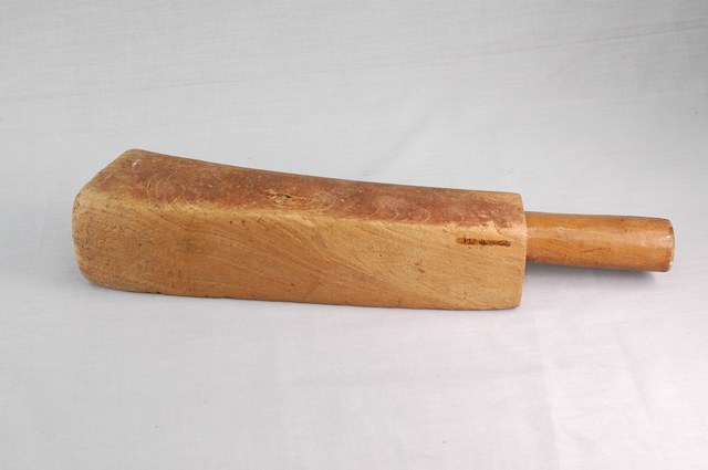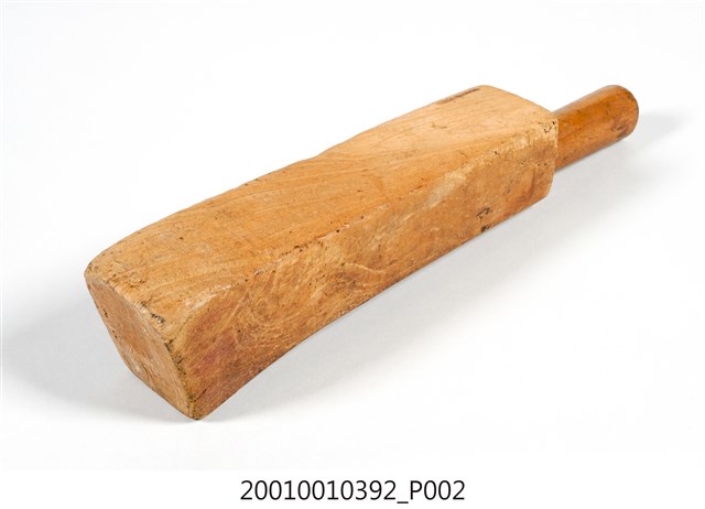 本件為釘銀紙用木槌,木頭製作,圓形木柄方便單手持拿和舉起,木柄連接長方體的槌體,槌體頂端微微翹起且厚實以利敲擊。