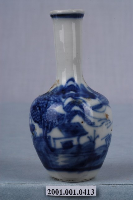 1. 白瓷山水紋長頸瓶圓唇,侈口,細長頸,圓肩,圓腹,弧壁下收至器底,底緣微微往內收。器表滿施白釉,厚釉,釉色青白濃郁,以鈷藍釉在腹部裝飾,青花發色較重。從口部可見器內並沒有施釉,露胎,胎質較粗且顏色略帶黃。口沿處繪粗弦紋裝飾,腹部描繪山水、房屋等日常漁家景緻,用筆灑脫隨性,畫風樸實瀟灑。2.依據器形推測,長頸瓷瓶大多作為花器使用。