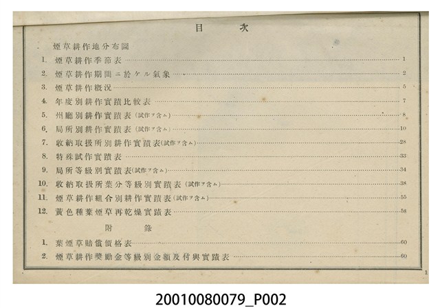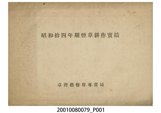 1.本物件為昭和14年期煙草耕作實蹟,由臺灣總督府專賣局於昭和15年5月4日編印發行。內容記錄了煙草的耕作分布、耕作季節、耕作概況等資訊。