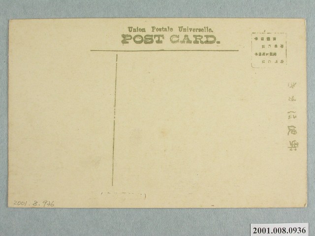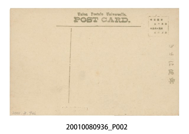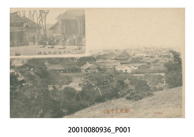 1.本物件為以彰化孔廟及其祭典為主題之明信片,其正面有兩張黑白照片,左上為祭孔儀式的黑白照片,右側4人身著中國服飾,後方眾多學童排列參加,影像下方標註為「孔子廟祭典參拜」;下方為自坡地拍攝的孔廟及周邊全景黑白照片,標註為「(彰化孔子廟)」 。背面為空白明信片直式書寫面,以黑色單色印刷,左上角有一方框,內容印刷字體有些模糊,內容為郵資說明,方框右側「郵便はがき」,左方位置則標有兩段英文字「Union Postale Universell」、「POST CARD」。2.彰化孔廟興建於西元1726年,為彰化縣學, 1759年重修。日治時期,藉由市街改正拆除孔廟部份建築, 1978年據原狀重修。現為國定古蹟。