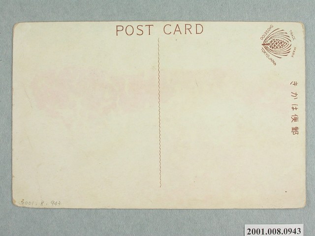 1.本物件為以臺中柳川為主題之明信片,其正面為臺中柳川彩色照片,影像左側有7隻鳥於川中駐留,影像上方註有「臺中やなぎ川」以及「棚邊書店發行」。背面為空白明信片直式書寫面,以咖啡色單色印刷,左上方有一個毬果狀的圖樣,圖樣上下方分別有兩段英文「TRADE MARK」、「SHOSEIDO TOKYO JAPAN」,圖樣有「郵便はがき」,明信片左方位置標註「POST CARD」,中間有一曲線分隔線。