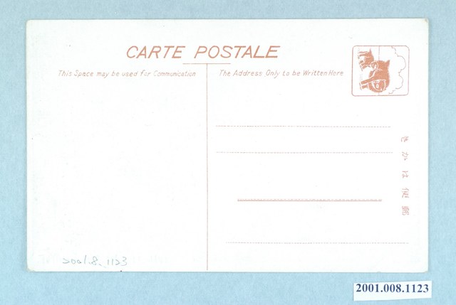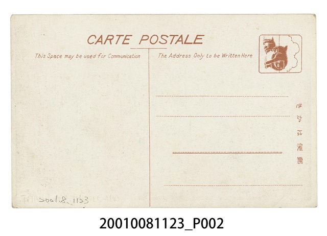 1.本物件為以化學之泉為主題之明信片,其正面為新竹天然瓦斯研究所建築物外觀黑白照片,影像右側建築物入口處,以鐵鍊拉起,建築物上方則刻有「天然瓦斯研究所」,影像左上角位置註有「化學の泉」,右下角則標有「.新竹市.」三字。背面為空白明信片直式書寫面,以橘紅色單色印刷,左上角方框中印有1隻大熊與1隻小熊的圖樣,圖樣右側位置標註「郵便はがき」,明信片左方以英文印有「CARTE POSTALE」,及左下「This Space may be used for Communication」,左上「The Address Only to be Written Here」,中間有一條分隔線。