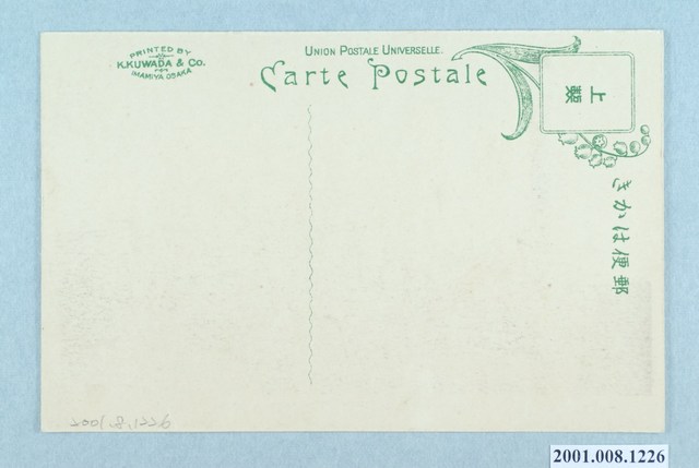 1. 本物件為以鹽水港製糖株式會社壽工廠為主題之明信片,其正面為壽工廠黑白照片,影像左側有一疑似煙囪的建築物,後方為壽工廠廠房,右邊道路上兩側共有4支電線桿,並有一人行走於道路上;影像下方由右至左標註「鹽水港製糖株式會社 壽工廠」、「岸山發行」。背面為空白明信片直式書寫面以綠色單色印刷,左上角方框旁繪有鈴蘭插畫,內側寫有「上製」,方框右側有「郵便はがき」,左下角有一三段英文組成的橢圓形圖樣,由左至右分別為「PRINTED BY」、「K.KUWADA & CO.」、「IMAMIYA OSAKA」,明信片左方寫有兩段英文「UNION POSTALE UNIVERSELLE」、「CARTE POSTALE」,中間以一條綠色曲線做分隔線。2. 西元1910年賀田金三郎在花蓮港至卑南一帶的土地開拓事業,併入由荒井泰治(荒井泰治曾於西元1907年買下鹽水港製糖)成立的臺東拓殖株式會社。1912年為了精簡業務內容,會社更名為「臺東拓殖製糖株式會社」同時,因官營鐵路花蓮港至鳳林段通車,於1913年將壽工廠轉型為新式製糖工場。