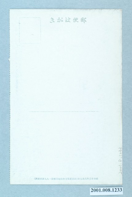1.本物件為以舊式糖廍為主題之明信片,其正面為舊式糖廍黑白照片,影像中有一以乾草建築,三角型外觀的建築物,左下角標註「(舊式糖廠)臺灣製糖株式會社橋子頭工場構內にあり」。背面為空白明信片直式書寫面,以綠色單色印刷,左上方框為郵票黏貼處,上方有「郵便はがき」,下方標有「昭和十三年六月七日(高雄要塞司令部地帶模第一九九號承認濟)」,中間有一虛線分隔線。