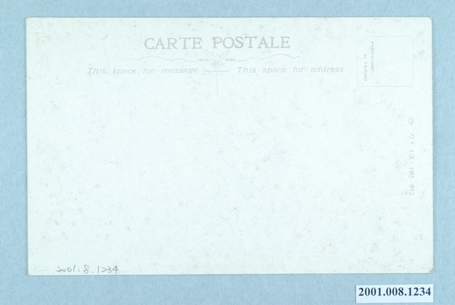 1. 本物件為以製糖會社甘蔗列車為主題之明信片,其正面為甘蔗列車黑白照片,影像中有5條運輸軌道,其中3條上皆有載滿甘蔗的甘蔗列車,影像左側偏上位置有2座煙囪正在冒煙,影像右上角標註「A sugar-manutactory and a sugar-cane train Taiwan.」,右下方標註「(台湾の物產)」、「製糖會社き甘蔗列車」,中間有一段描述「臺灣中部地方の平野には多くの甘蔗が產出されろ。それで臺灣には臺中市を中心きじて幾多大規模な製糖會社がある。大抵各々甘蔗を運ぶ專用軌道をもてつてみて、耕作地から幾連もの運搬列車が々きけ、貯積場には忽ち甘蔗の山出來ろ。それを最新式各種の機械力によつて、ドンドン加工じ製糖する。」背面為空白明信片直式書寫面,以黑色單色印刷,左上角一方框,內寫有「MANUFACTURE BY TAISHO」,方框右側有「郵便はがき」,明信片左方位置標有「CARTE POSTALE」,以及一隻張開雙翼,腳抓持「TAISM」的鳥,並標有「TRACDE MARK」,分隔線上下兩旁英文字,上為「this space for address」、下為「this space for message」。