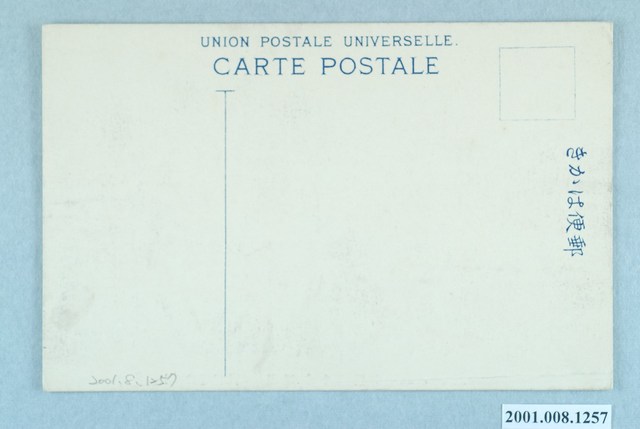 1. 本物件為以臺灣水牛戲水為主題之明信片,其正面為水牛戲水黑白照片,影像中有14隻左右的水牛,其中有11隻在水中,影像左上方蓋有「見本」的紫色方框印章,即樣本之意。下方標註「[不許復製](註:應是複之訛字)」、「臺灣水牛ノ遊(註:遊通游)水」、「(1)Buffalo in Formosa.」。背面為空白明信片橫式書寫面,以藍色單色印刷,右上角有一方框為郵票黏貼處,右側註有「郵便はがき」,中央上方則標有兩段英文字「UNION POSTALE UNIVERSELLE」、「CARTE POSTALE」,中間偏左有一條分隔線。
