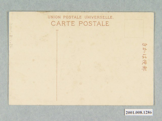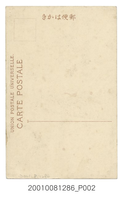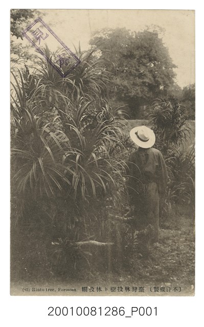 1. 本物件為以臺灣林投樹與林投帽為主題之明信片,其正面為林投樹黑白照片,影像中有一名頭戴林投帽的和服男性,旁為製作林投帽的材料來源林投樹,影像左上蓋有「見本」兩字的方框印章,下方標註「(不許複製)」、「臺灣林投樹林ト林投帽」、「(45) Rinto tree, Formosa.」。背面為空白明信片橫式書寫面,以橙紅色單色印刷,右上角有郵票黏貼處,右側「郵便はがき」,上方則標有兩段英文字「UNION POSTALE UNIVERSELLE」、「CARTE POSTALE」,中間偏左有一條分隔線。2. 林投帽為以林投樹的葉子為原料製成,為西元1900年代日本內地勸業展覽會的展覽品之一,又有「東洋巴拿馬帽」、「臺灣巴拿馬帽」的異名。傳言林投帽的發明者為彰化監獄的日籍官吏,將監獄的受刑人化為勞動力進行生產,但在1915年臺灣總督府將斷髮納入保甲規約之後,帽子的需求量增加,女工亦成為製帽產業中的支柱之一。