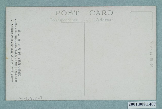 1. 本物件為以臺灣印象為主題之明信片,其正面為臥床吸食鴉片的男子彩色繪圖,繪圖中有一名橫臥床鋪的竹蓆上,穿著黑色外衣的老人,其前方擺設的為吸食鴉片的器具。背面為空白明信片橫式書寫面,以黑色單色印刷,右上方框為郵票黏貼處,右側有「郵便はがき」,左側「(臺灣の印象)阿片を吸ふ男」、「罌粟の果殼より精製した阿片(黑い液体)を竹筒に入れ點火しその煙を吸ふのである。其の結果中毒を起し身体は衰弱する」(大意為:鴉片為以罌粟果殼精製而成,外觀為黑色的液體,將其放置在竹筒中後點火,吸食其所產生的煙。結果是會引發中毒並導致身體衰弱。)上方標註:「POST CARD」,其下左側「Correspondence」、右側「Address」,中間有一條分隔線。2. 鴉片為日治時期重要的專賣品之一,其專賣制度因後藤新平提議的漸禁政策而實行有48年之久,西元1896年在總督府公布製藥所官制後,使總督府具有鴉片煙膏製作特權,而在1900年9月底保甲系統的調查下,可確認的鴉片癮者已有16萬9千多人,並至1930年時中央研究院設立臺北更生院進行矯正。