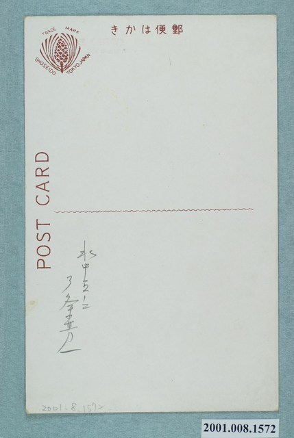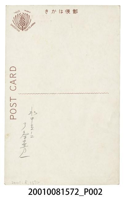 1.本物件為以臺灣果實王芭蕉為主題之明信片,正面為芭蕉彩色圖像,畫面中可見1串已經熟成轉黃的芭蕉垂掛著,右上有2段文字,第1段「臺灣果實王(芭蕉實)」,第2段「(棚邊書店發行)」;背面為空白明信片直式書寫面,以紅色單色印刷,左上為商標圖案其形狀如松菓,另有2行字樣,由上至下為「TRADE MARK」、「SHOSEIDO TOKYOJAPAN」,上方有「郵便はかき」字樣,左側有「POST CARD」字樣,左下處有鉛筆書寫痕跡,有「水中五-二□□芳一」。