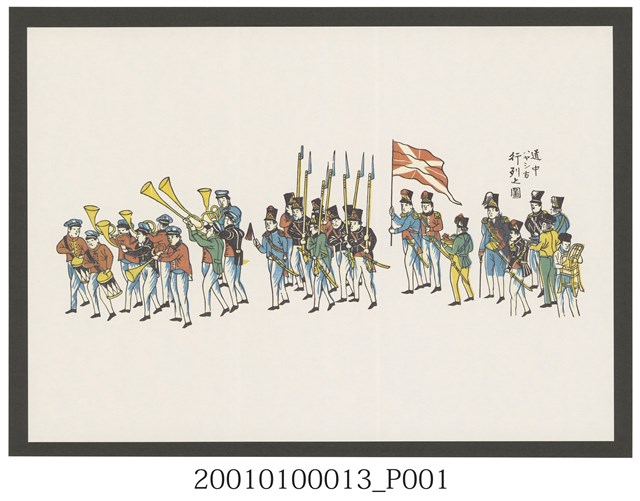 1. 本物件為彩色版畫,內容記錄於長崎地區的外國人使節抵達上陸時,軍樂隊吹奏行進間的樣態,包含錦旗、樂器、服儀等。2. 長崎版畫為日本江戶中期至明治時期所流行的浮世繪,長崎作為日本鎖國時期唯一的對外港口,此地區因獨特的生活環境而衍生出「長崎版畫」或「長崎繪」。此類畫作特色為主題的題材多為描繪當時被限制居住於出島的荷蘭人與中國清朝人,表現其生活狀況。長崎版畫的畫風與江戶地區的浮世繪不同,其受蘇州版畫與西洋畫影響較深。此時期的畫作於現在不論是歷史或是美術方面皆為重要的資料。