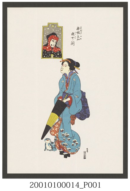 1. 本物件為彩色版畫,呈現冬天之景象,遊女手持雨傘,其衣物衣襬處的植物還被白雪覆蓋,圖中可由落款看出為「長崎大和屋」印製。2. 長崎版畫為日本江戶中期至明治時期所流行的浮世繪,長崎作為日本鎖國時期唯一的對外港口,此地區因獨特的生活環境而衍生出「長崎版畫」或「長崎繪」。此類畫作特色為主題的題材多為描繪當時被限制居住於出島的荷蘭人與中國清朝人,表現其生活狀況。長崎版畫的畫風與江戶地區的浮世繪不同,其受蘇州版畫與西洋畫影響較深。此時期的畫作於現在不論是歷史或是美術方面皆為重要的資料。