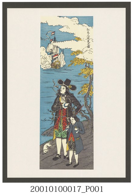 1. 本物件為彩色版畫,畫面為紅毛人(荷蘭人)眺望遠方荷蘭船之景象。2. 長崎版畫為日本江戶中期至明治時期所流行的浮世繪,長崎作為日本鎖國時期唯一的對外港口,此地區因獨特的生活環境而衍生出「長崎版畫」或「長崎繪」。此類畫作特色為主題的題材多為描繪當時被限制居住於出島的荷蘭人與中國清朝人,表現其生活狀況。長崎版畫的畫風與江戶地區的浮世繪不同,其受蘇州版畫與西洋畫影響較深。此時期的畫作於現在不論是歷史或是美術方面皆為重要的資料。