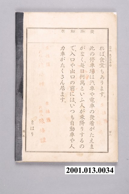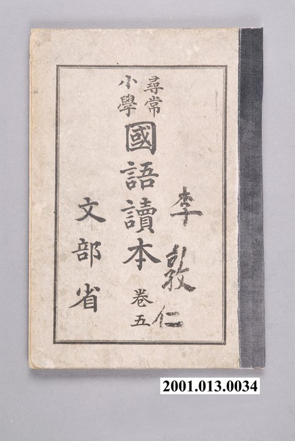 本件為文部省編纂、發行之《尋常小學國語讀本》,卷次為第5卷,發行時間不詳。封面署有「李敦仁」之名,內頁版次分成上、下兩欄,上欄為生難字,下欄為課文,內容包括「大日本」、「八幡太郎」、「日本三景」等課目,共計26課。本物件後半部缺頁,無版權頁。