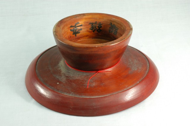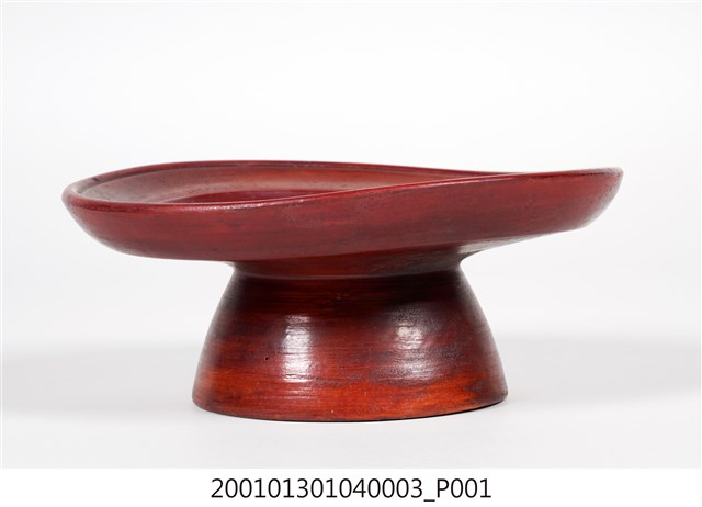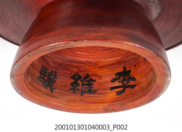1.高腳供盤以單塊木頭刨削雕磨出一體成形的圓形木製盤子,整體結構完整,雕工簡單、樸拙。盤正面由外至內雕有四道圓線紋作為裝飾,形成盤面有五個同心區塊;背面有一道圓線紋,線紋以內略為減地削磨,具有結構性的裝飾。底部為中空圈柱狀的高足,周徑由盤面漸向足底擴大,以增加穩定性。正面第一(口緣)、三、五(盤心)的同心區塊,以及背面口緣處塗有棕紅色漆,其餘的部分僅在木胎上刷透明亮漆,形成一種塗彩設計的美感;木胎部分可看出由機器刨磨製成的痕跡。圈足內側有隸書體寫的黑色「李維驥」三字,主要是因為早年廟會時各家都會自行準備供盤擺放貢品,因為形狀色彩都大同小異,所以會在底部書寫各家姓名,以免在廟會拜拜收供盤時拿錯。圈足與盤面交接處繫有一條紅線,用以增添喜氣與避邪。此件保存狀況尚佳,因為木料材質,盤面體已有些微變形,盤面下方有部分刮磨處有塵泥嵌卡的狀況。2.此類木料材質的高腳供盤又稱「豆盤」、「四果盤」。是臺灣早期社會在祭祀、節慶、下聘時置於供桌上用來擺放供品的器皿,供品通常是粿粄、水果、糖果蜜餞等,擺設時大都會放置以三至五盤為主。隨著時代發展,高腳供盤逐漸出現銅製、鋁製、不繡鋼製、塑膠製等,時至今日,常見的多為紅色塑膠材質。