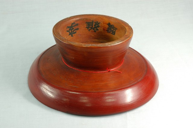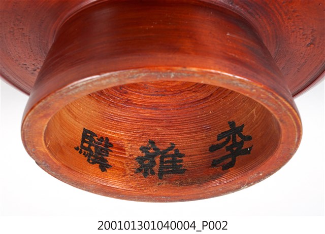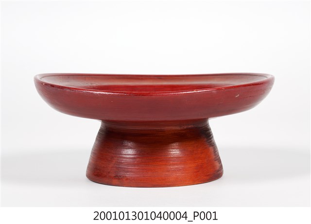 1.高腳供盤以單塊木頭刨削雕磨出一體成形的圓形木製盤子,整體結構完整,雕工簡單、樸拙。盤正面由外至內雕有四道圓線紋作為裝飾,形成盤面有五個同心區塊;背面有一道圓線紋,線紋以內略為減地削磨,具有結構性的裝飾。底部為中空圈柱狀的高足,周徑由盤面漸向足底擴大,以增加穩定性。正面第一(口緣)、三、五(盤心)的同心區塊,以及背面口緣處塗有棕紅色漆,其餘的部分僅在木胎上刷透明亮漆,形成一種塗彩設計的美感;木胎部分可看出由機器刨磨製成的痕跡。圈足內側有隸書體寫的黑色「李維驥」三字,主要是因為早年廟會時各家都會自行準備供盤擺放貢品,因為形狀色彩都大同小異,所以會在底部書寫各家姓名,以免在廟會拜拜收供盤時拿錯。圈足與盤面交接處繫有一條紅線,用以增添喜氣與避邪。此件保存狀況尚佳,因為木料材質,盤面體已有些微變形,盤面上方與下方的部分凹孔現象應是製作之初就已有的瑕疵。2.此類木料材質的高腳供盤又稱「豆盤」、「四果盤」。是臺灣早期社會在祭祀、節慶、下聘時置於供桌上用來擺放供品的器皿,供品通常是粿粄、水果、糖果蜜餞等,擺設時大都會放置以三至五盤為主。隨著時代發展,高腳供盤逐漸出現銅製、鋁製、不繡鋼製、塑膠製等,時至今日,常見的多為紅色塑膠材質。