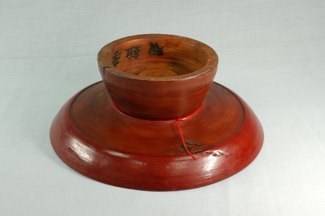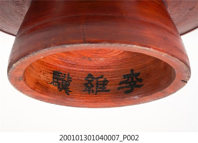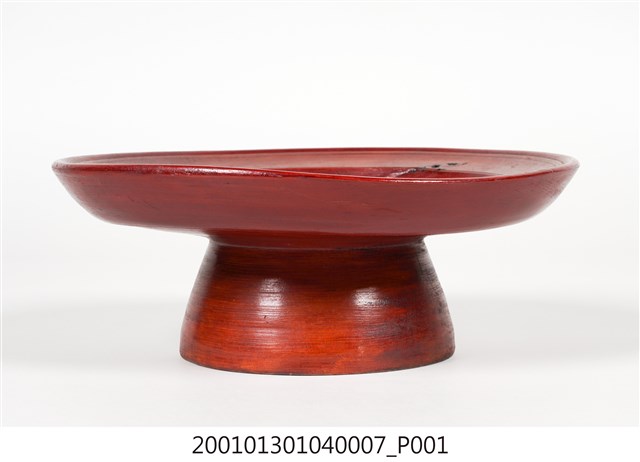 1.高腳供盤以單塊木頭刨削雕磨出一體成形的圓形木製盤子,整體結構完整,雕工簡單、樸拙。盤正面由外至內雕有四道圓線紋作為裝飾,形成盤面有五個同心區塊;背面有一道圓線紋,線紋以內略為減地削磨,具有結構性的裝飾。底部為圈柱狀的高足,內部有一塊連接著盤底的實心圓柱,周徑由盤面漸向足底擴大,以增加穩定性。正面第一(口緣)、三、五(盤心)的同心區塊,以及背面口緣處塗有棕紅色漆,其餘的部分僅在木胎上刷透明亮漆,形成一種塗彩設計的美感;木胎部分可看出由機器刨磨製成的痕跡。圈足內側有隸書體寫的黑色「李維驥」三字,主要是因為早年廟會時各家都會自行準備供盤擺放貢品,因為形狀色彩都大同小異,所以會在底部書寫各家姓名,以免在廟會拜拜收供盤時拿錯。圈足與盤面交接處繫有一條紅線,用以增添喜氣與避邪。此件保存狀況尚佳,因為木料材質,盤面體已有些微變形,以及些微蟲蛀的孔洞。2.此類木料材質的高腳供盤又稱「豆盤」、「四果盤」。是臺灣早期社會在祭祀、節慶、下聘時置於供桌上用來擺放供品的器皿,供品通常是粿粄、水果、糖果蜜餞等,擺設時大都會放置以三至五盤為主。隨著時代發展,高腳供盤逐漸出現銅製、鋁製、不繡鋼製、塑膠製等,時至今日,常見的多為紅色塑膠材質。