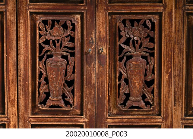 臺灣供奉祖先牌位的方式有二,一是神龕式,如同一小型神龕,中央木板寫某姓歷代祖先牌位,左下方題「陽世子孫奉祀」。背面可打開,有一片片小木牌,寫祖妣名諱、生辰、忌日等。立碑式則是一大面木牌,寫歷代祖先名諱,背面可打開,寫祖先名諱,生辰、忌日等。本件屬於前者,類似一小神龕,以透雕方式,刻有眉門簾,中間刻有蝙蝠,左右有扇及葉,代表開枝散葉。整片門扇則以透雕方式分為三層,上層為琴、棋、書、畫,中層為花瓶、下層為變形饕餮紋,作為裝飾。中間扇門可開啟,內可置祖先姓名及生卒年資料等。雕工精美。