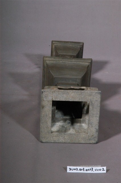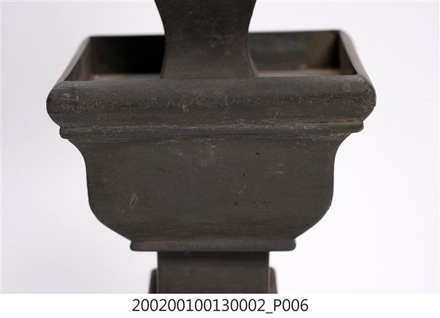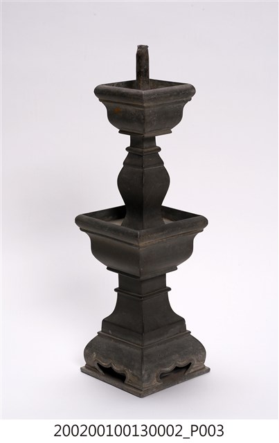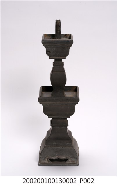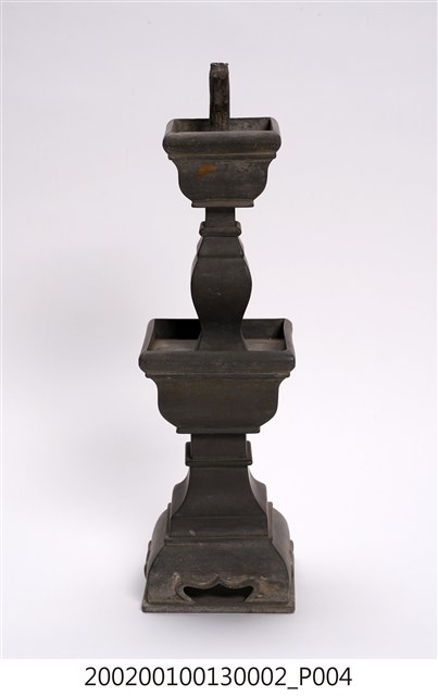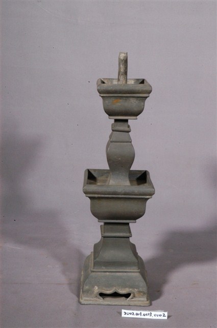 本件為錫製燭臺,作方體造形,中間壺身,器身完好燭針略見插燭使用痕跡,未見紋飾與年款。燭臺是安置蠟燭以祭祀神祇、祖先的禮器。分成祭祀、儀式用具和一般室內用具兩種,前者形體較大,工藝精緻,成對配置,如龍鳳燭臺、壽字燭臺等等,本件屬於祭祀之禮器。燭臺材料多見錫、陶、瓷、銅、木等等。