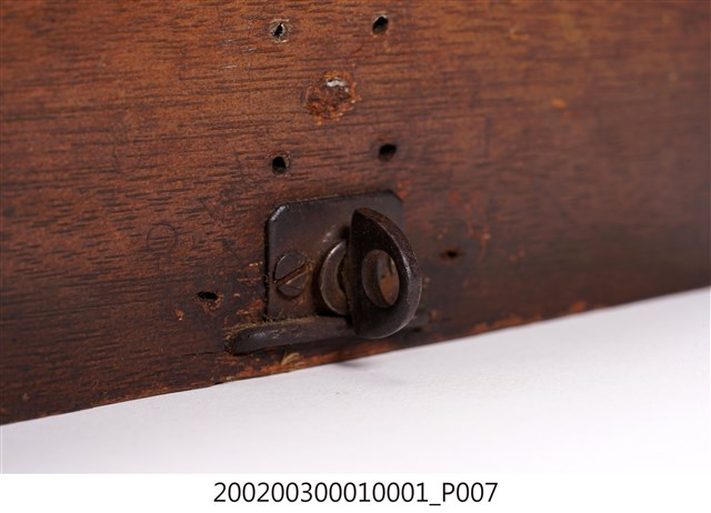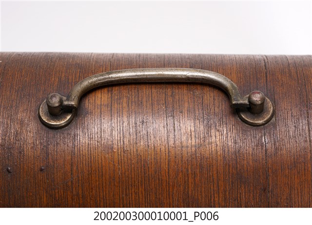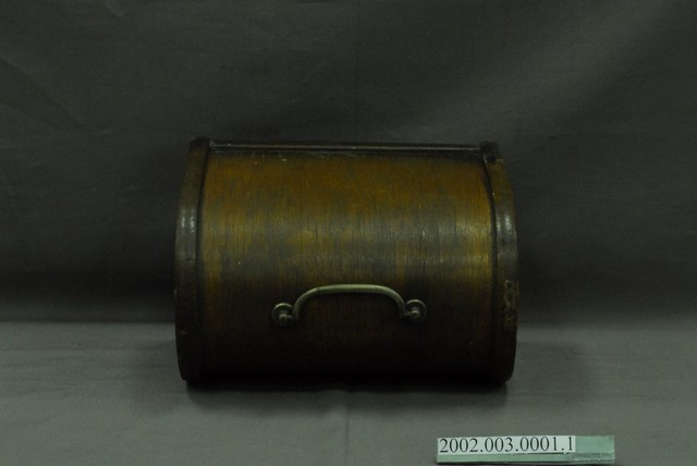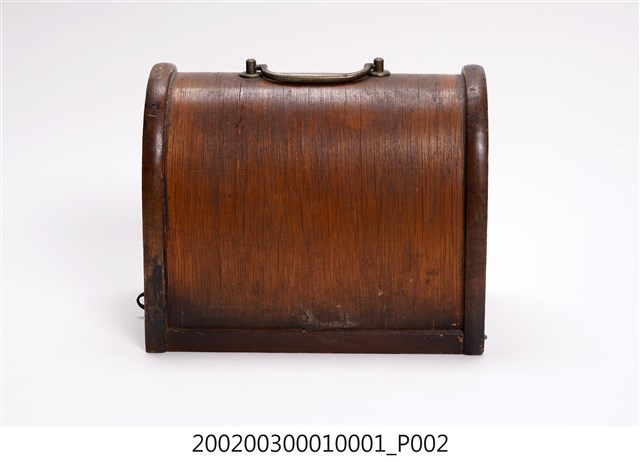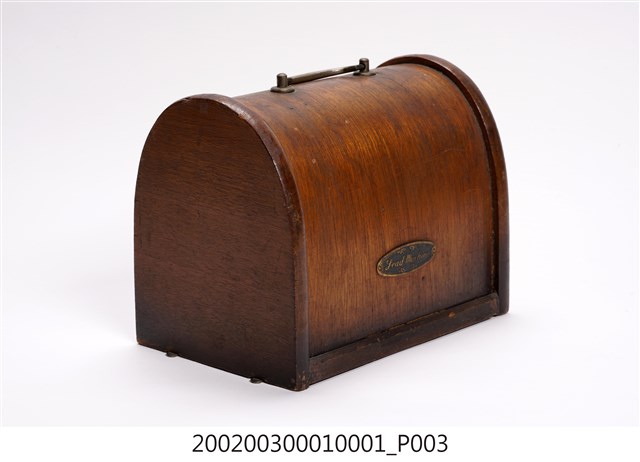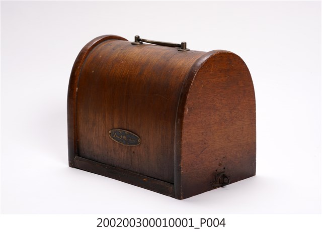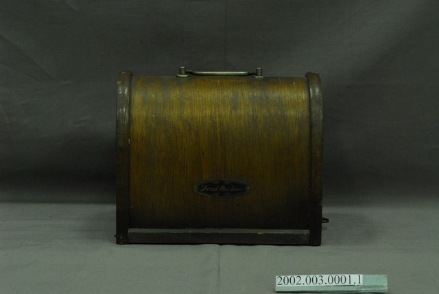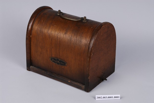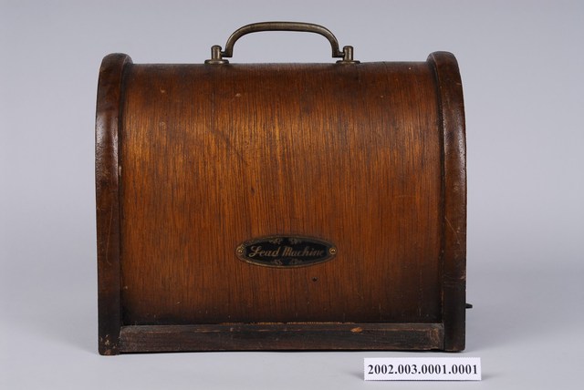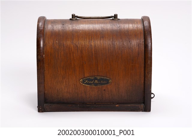 本文物為手搖式裁縫車外盒,為木質,上面有金屬掛環,下方有「Fand MACHINE」的標誌。1970年英國人湯瑪斯‧聖特(Thomas Saint)為提高製鞋效率設計手搖裁縫機,在多次的改良之下,時至1854年多數家庭使用之腳踏裁縫機才出現。而傳統家庭中的縫紉工作多由女性擔任,因此縫紉機出現反映女性生活與科技互動,所產生工作型態之改變。