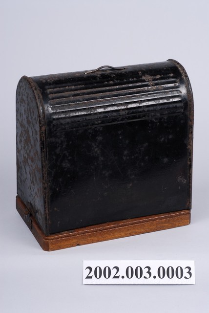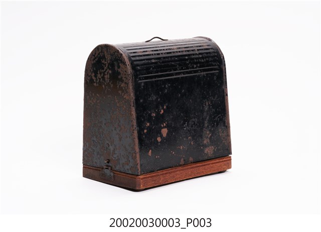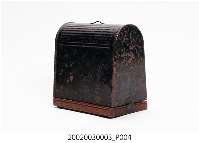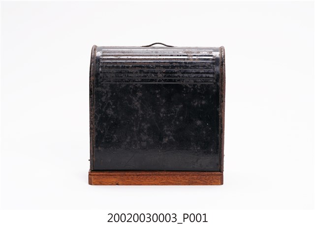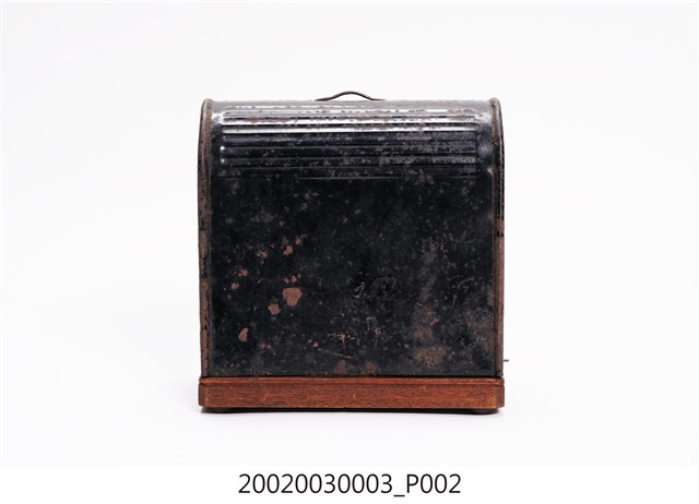 本文物為手搖式縫紉機,主要為金屬材質,有一輪盤上面有咖啡色握把,其以槓桿原理使該裁縫機運作,下方有一木質底座。1970年英國人湯瑪斯‧聖特(Thomas Saint)為提高製鞋效率設計手搖裁縫機,在多次的改良之下,時至1853年多數家庭使用之腳踏裁縫機才出現。而傳統家庭中的縫紉工作多由女性擔任,因此縫紉機出現反映女性生活與科技互動,所產生工作型態之改變。