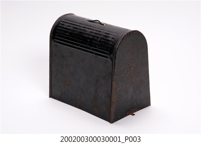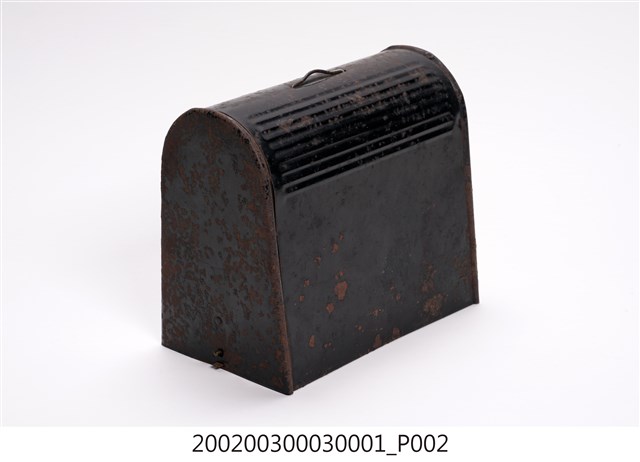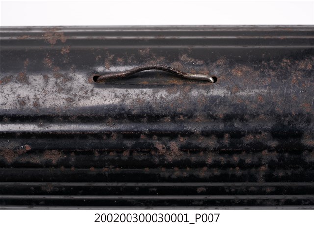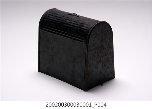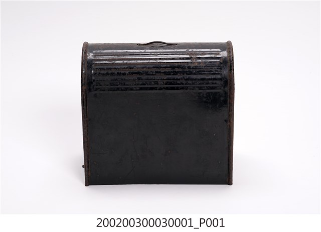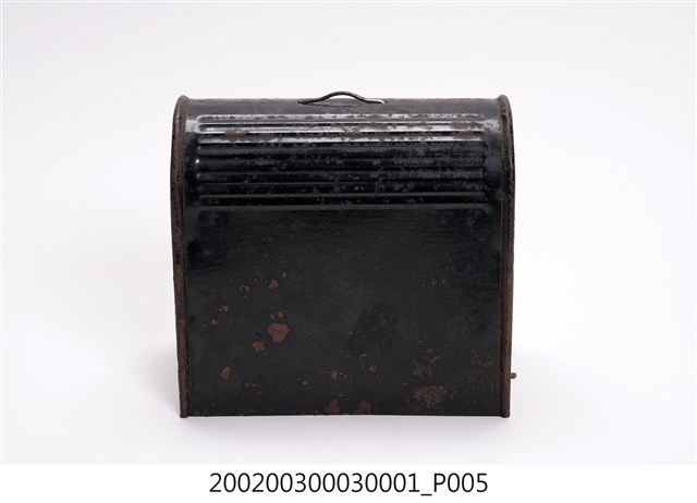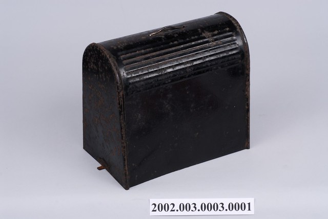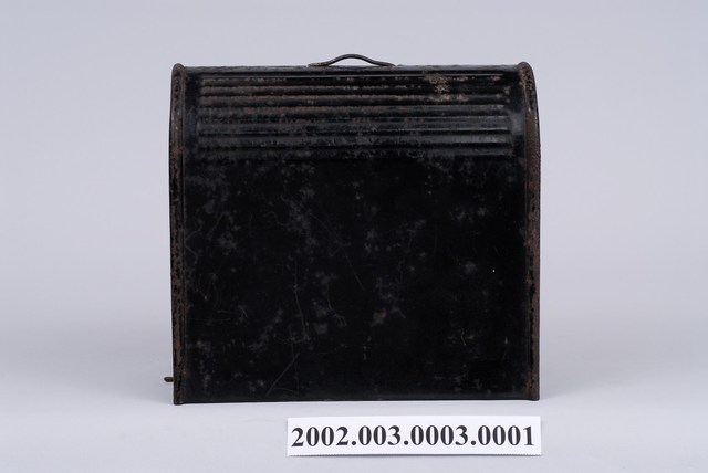 本文物為手搖式裁縫車外盒,為木質,整體為黑色,上面有金屬掛環。1970年英國人湯瑪斯‧聖特(Thomas Saint)為提高製鞋效率設計手搖裁縫機,在多次的改良之下,時至1854年多數家庭使用之腳踏裁縫機才出現。而傳統家庭中的縫紉工作多由女性擔任,因此縫紉機出現反映女性生活與科技互動,所產生工作型態之改變。