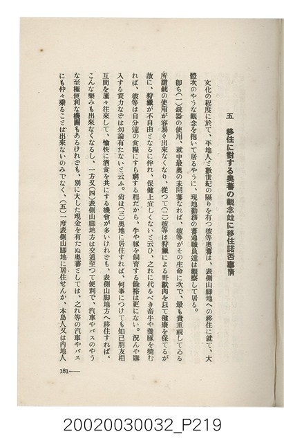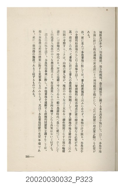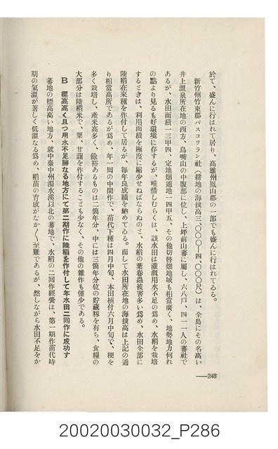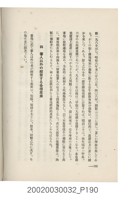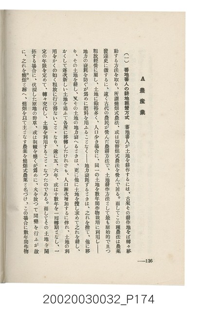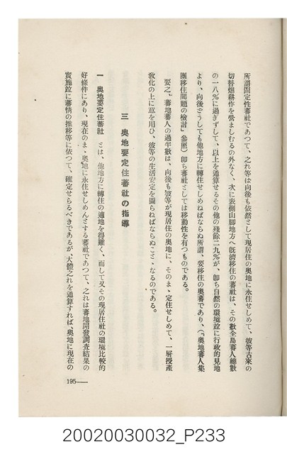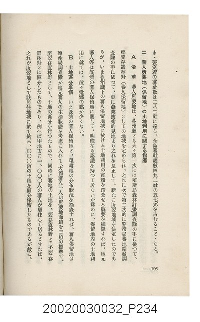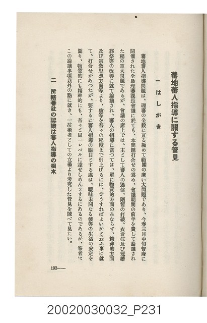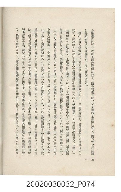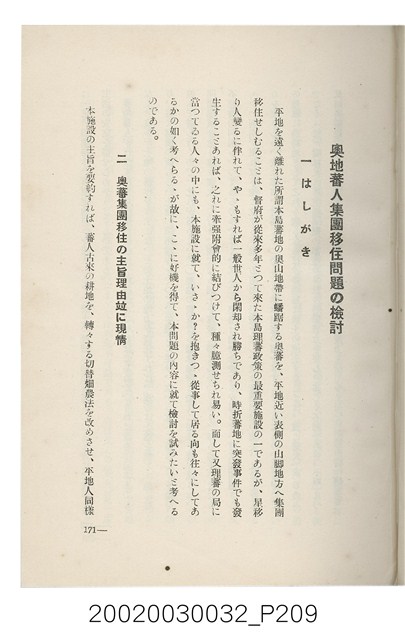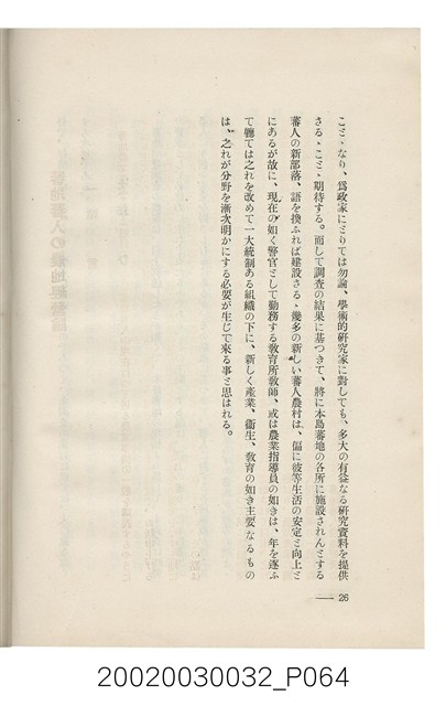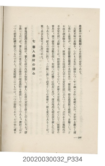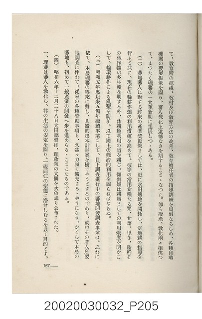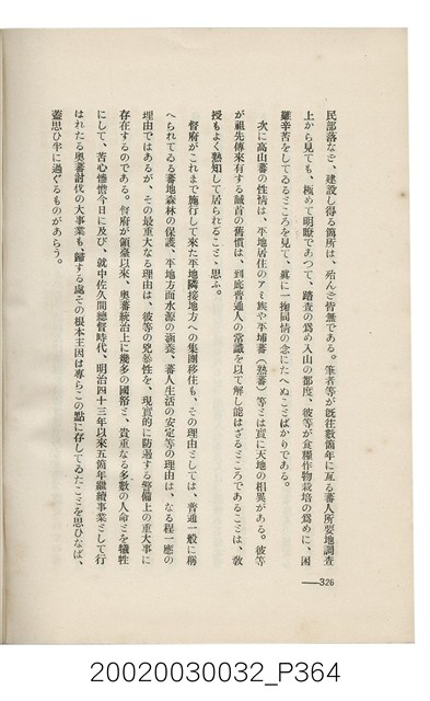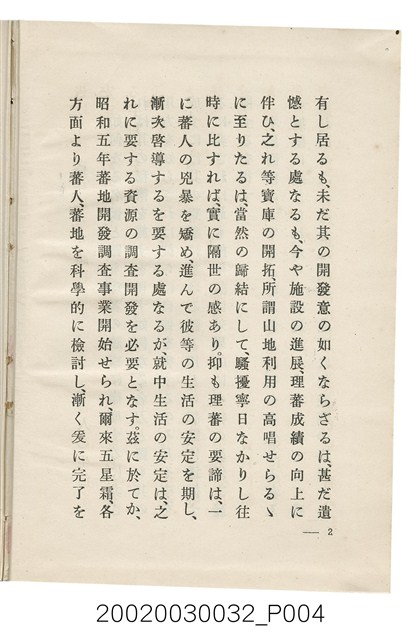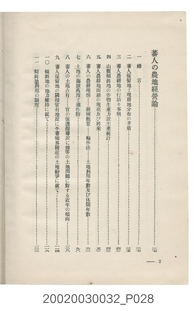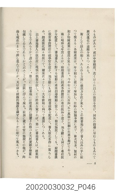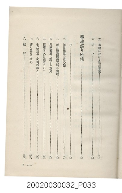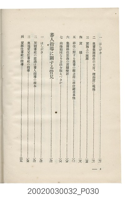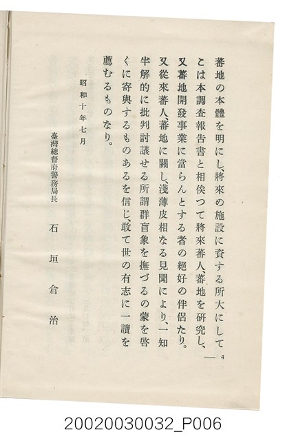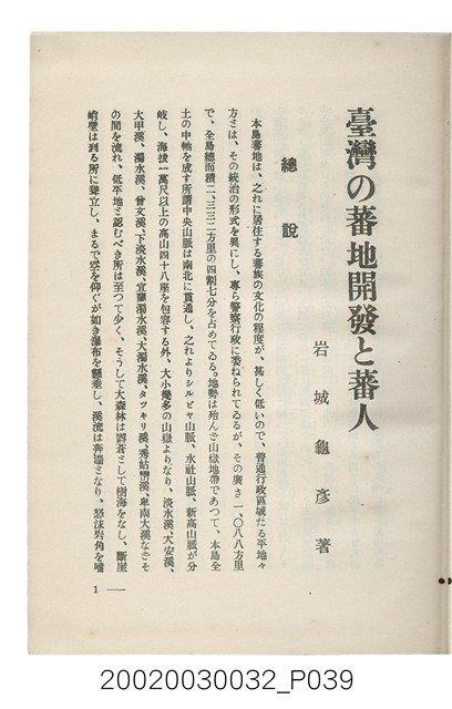 1.本書為岩城龜彥所著,其內容主要探討臺灣原住民的農業、畜牧業、住居、各地原住民部落等開發事宜。內附總督府警務局長石垣倉治所撰之序文。本書的章節包括:臺灣の蕃地開發調查に就て、蕃地蕃人の農地經營論、蕃地の經濟價值、奧地蕃人集團移住問題の檢討、蕃地蕃人指導に關する管見、蕃地に於ける水稻耕作上の新傾向、蕃人食糧問題と陸稻作、蕃地に於ける里芋に就て、本島に於ける牧畜事業と蕃地の開發、蕃地巡り所感、蕃地開發調查の旣往竝に將來、臺灣官民諸名士の蕃地開發私案に就て;其所收錄的插圖有:著者[岩城龜彥]徒步旅行ノ足跡圖、奧地居住蕃人の蕃社(臺中州能高郡トロコ社、海拔高4,850尺)、奧地居住蕃人の蕃社(高雄州潮州郡クナナウ社、海拔高3,500尺)、集團蕃社の階段水田(臺北州羅東郡ルモアン社、海拔高2,000尺)、集團蕃社の階段水田(新竹州竹東郡シラツク社、海拔高1,900尺)、集團移住蕃社の改良蕃屋(花蓮港廳研海支廳ブスリン社、海拔高180尺)、集團移住蕃社改良住屋の内部(花蓮港廳研海支廳ブスリン社、海拔高180尺)、先進蕃社の青年團(花蓮港廳研海支廳ブスリン社、海拔高180尺)。2.本物件與館藏登錄號2003.033.0004之藏品相同。
