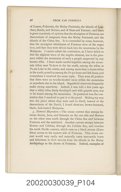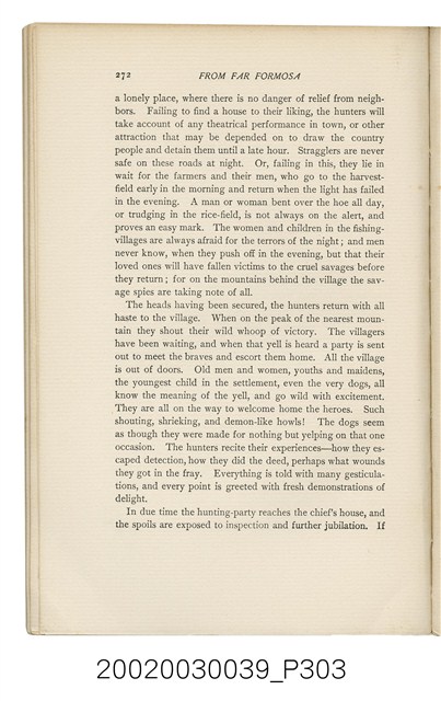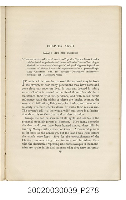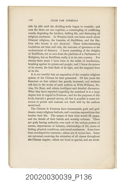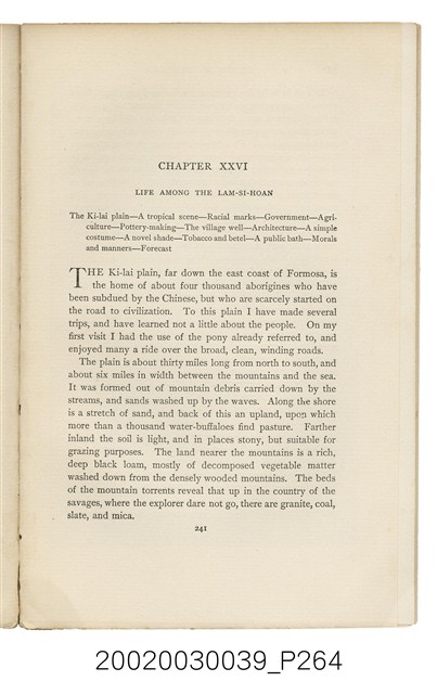 1. 本書作者為馬偕牧師(George Leslie MacKay),內容分六部分:第一部分是馬偕的生平介紹及到淡水的過程;第二部分是關於臺灣的描述,其中涵蓋地理、歷史、植物、動物生態和民族;第三部分是有關臺灣漢人的敘述,包括政治、人民、產業、社交生活、傳教服務、教會的設立等等。第四部分著重於已被征服的平埔族(熟番);第五部分描述了山上原住民的生活和風俗,及獵頭族;最後一部分主要是敘述淡水及在那裡的傳教服務工作。