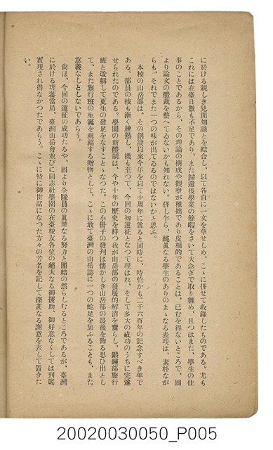 本書為日本同志社山岳部登山隊從京都出發,到臺灣登山的詳細紀錄,第一篇的內容包括登山隊成員的介紹,所征服之山脈包括南湖大山、大覇尖山、次高山、新高山、䓫萊主連峰、合歡山等,過程中還探訪了溫泉、原住民部落、日月潭、霧社等地。第二篇的內容為針對原住民的種別及戶口、土地制度、信仰、交通等等的研究報告。