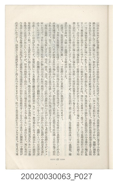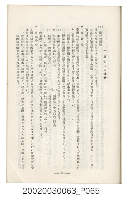本物件為昭和15年(1940)3所發行之《臺灣產業觀光事情》,其主要敘述內容包括:臺灣的概要(臺灣的交通、食物、觀光、產業等)、農產(砂糖、茶、芭蕉、落花生、柑橘、竹等)、畜產(牛豬、家禽、養蠶等)、礦產(金、石炭、硫磺、石油、天然瓦斯等)、專賣(樟腦、食鹽、菸草、酒)、水產、林業及其他的產業(旅行上注意、主要觀光地、主要的名所舊蹟、主要的溫泉等)。內附一張臺灣交通路線圖。