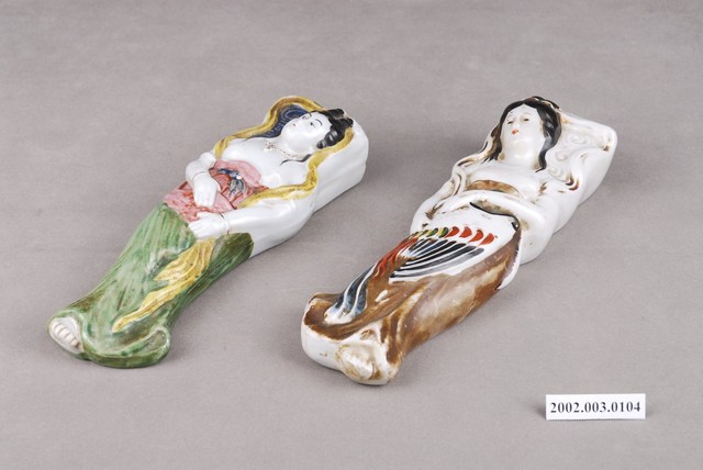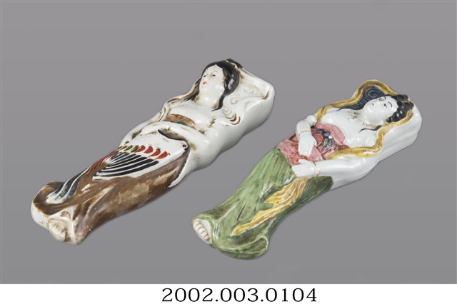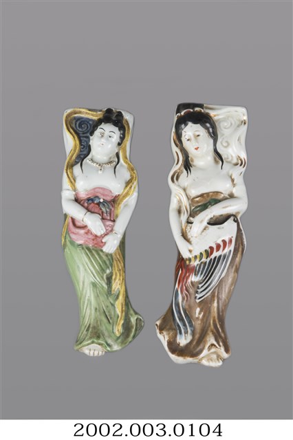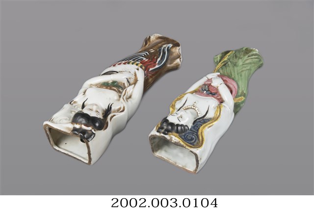 1.白瓷彩繪飛天壁花插對組為2件成對之藏品,器身以模具壓模製成,側身皆有明顯之模線,後以高溫燒製成潔白瓷器,再於器表彩繪各色顏料。壁花插對組大小略有不同,各於器身裝飾飛天人物,呈現姿態相同,左右對稱,並以不同之塗料彩繪飛天衣裙。2.壁花插又稱轎瓶、壁瓶、半瓶,為明清開始流行的裝飾品。原為達官貴人使用,因應轎內空間較為狹小,而出現剖半樣式之裝飾品,後來廣泛用於居家裝飾,可懸掛於牆面或床柱等。
