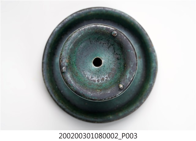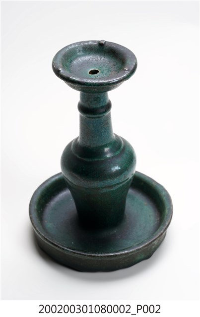 本件石灣窯綠釉冰裂紋燭臺為2件成對之部件2,長13.9公分,寬13.8公分,高18.1公分。器表除底面之外均以孔雀石綠色滿釉,部分釉彩堆積處呈深綠色,由於燒製時溫度落差之關係,於器表形成釉面開片成冰裂紋路。燭臺作上下2承盤樣式,頂端承盤作上寬下窄的厚唇侈口之平底圓盤,口緣於3端點有突起物,底面中心處有圓形貫穿至燭臺底部的孔洞,上承盤主要用來放置斗燭使用。承盤下接花瓶式立柱,作長頸鼓腹,下身逐漸收斂。底承盤同為底座,外型同為厚唇侈口,平底式圓盤。