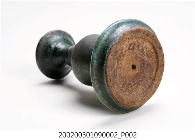 本件石灣窯綠釉冰裂紋燭臺為2件成對之部件2,長10公分,寬10.1公分,高15.3公分。器表除底面之外均以綠色滿釉,釉彩濃厚呈黑綠色,表面黯淡無玻璃光澤,底盤口緣處略帶青藍色。由於燒製時溫度落差之關係,於器表形成釉面開片成冰裂紋路。燭臺作上下2承盤樣式,頂端承盤作上寬下窄的厚唇侈口之平底圓盤,口緣於3端點有突起物,底面中心處有圓形貫穿至燭臺底部的孔洞,上承盤主要用來放置斗燭使用。承盤下接花瓶式立柱,作細長頸鼓腹,下身逐漸收斂。底承盤同為底座,外型同為厚唇侈口,平底式淺圓盤。