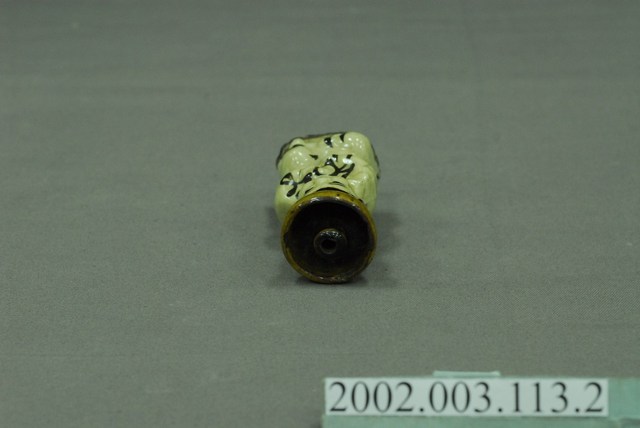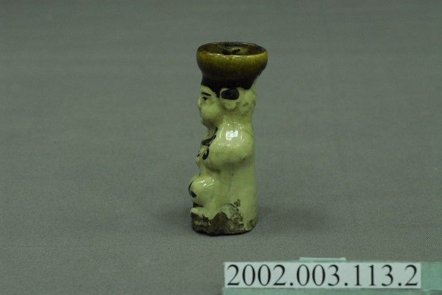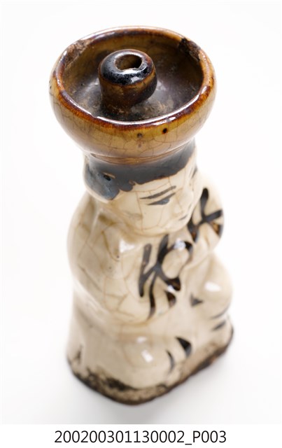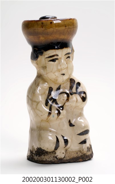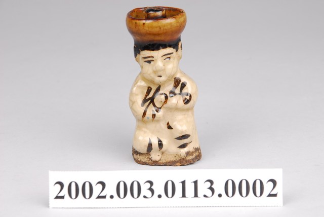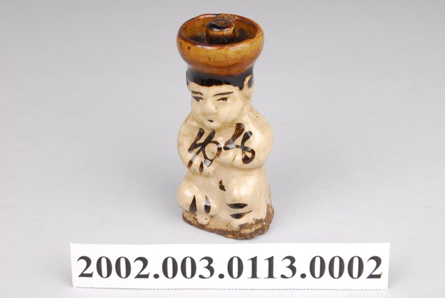 本件白瓷童子坐像燭臺為2件成對之部件2,長4.1公分,寬3.8公分,高8.5公分。整體燒製成潔白瓷器,童子呈半跏趺姿態,雙手於胸前靠攏,持握某物。以褐黑釉料繪製面部五官、頭髮與衣飾,其髮型作平瀏海,衣飾以畫筆隨意繪製,整體釉面較部件1完整。童子頭部頂有碗形承盤內有中空立柱,為固定斗燭之燭籤,承盤因釉色較淡呈現褐色。
