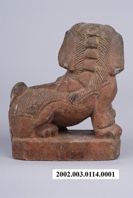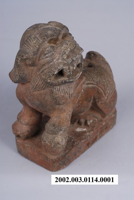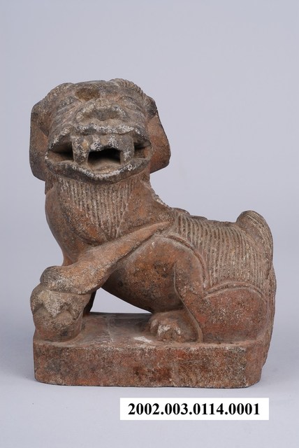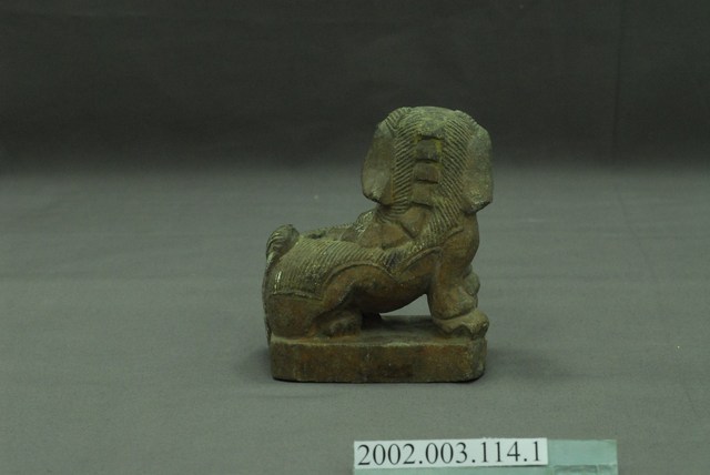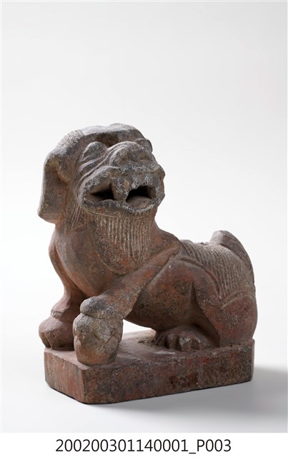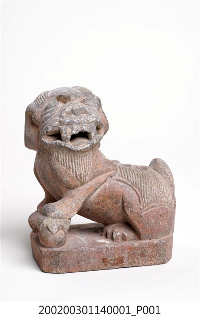 本件獅子戲球石燭臺為2件成對之部件1,長11.4公分,寬6公分,高13.2公分。燭臺以整塊石材雕刻成獅型,放置於左側位置。石獅以頭部朝右,採坐姿,前腳撐於地面,左前腳踏圓球。獅子身軀細長,面部作張口露牙,大耳狀,表情憨厚。其頭部到背脊有1道階梯型裝飾,四周以斜線紋作鬃毛表示。石獅於接近臀部之背上鑿空有圓形孔洞,可插入金屬或其他材質之燭籤,用以固定斗燭。