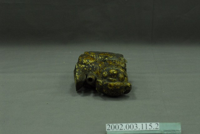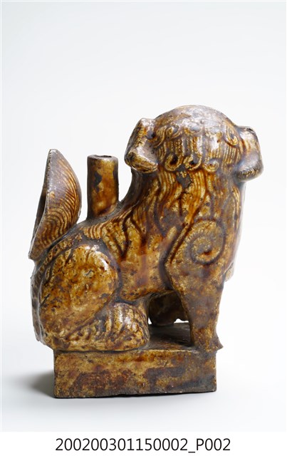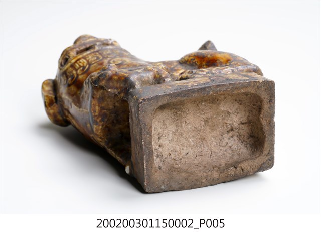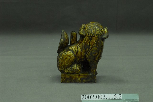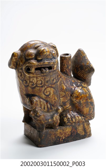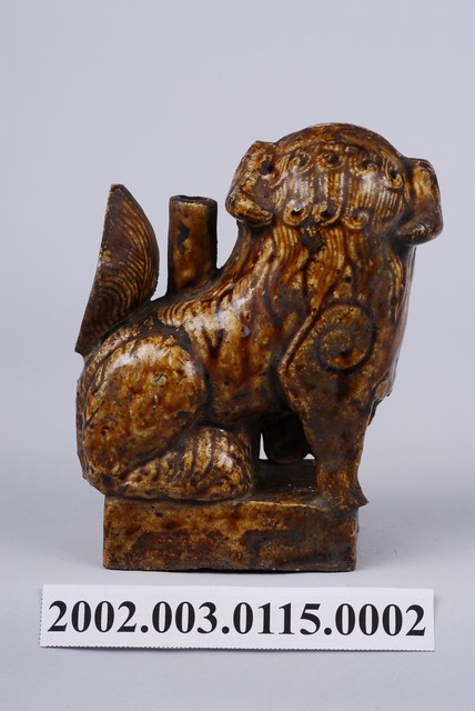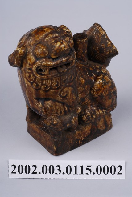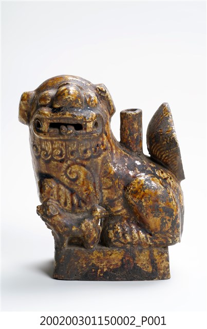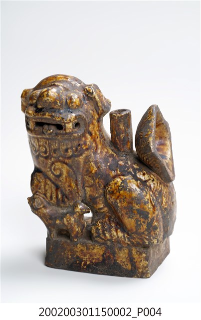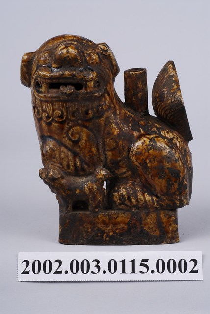 本件褐釉公獅燭臺為2件成對之部件,長11.6公分,寬6.4公分,高13.6公分,係以陶瓷胎體於器表施以褐釉燒製而成,主要放置於左側。母獅採坐姿置於長方型座臺上,頭部右轉,前腳撐於底面,左前腳踏幼獅。獅子面部作大眼、大鼻、張口吐舌貌,獅尾垂直翹起。其獅背上立有中空管狀燭籤,用以固定斗燭。