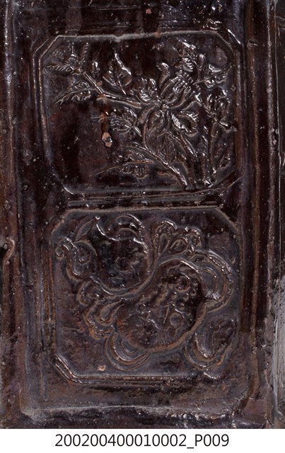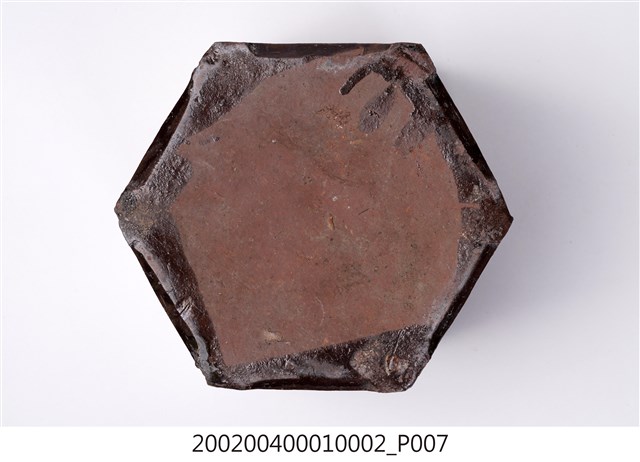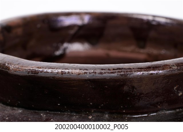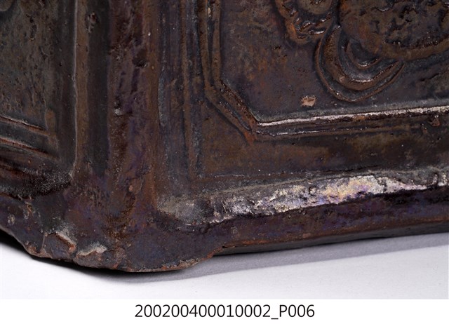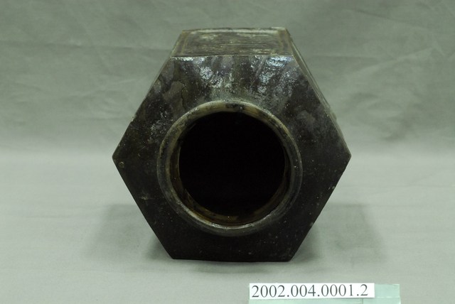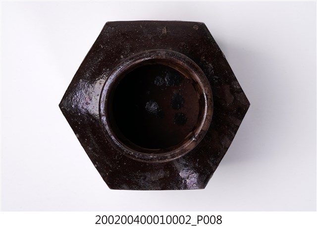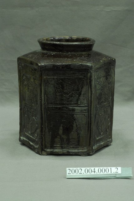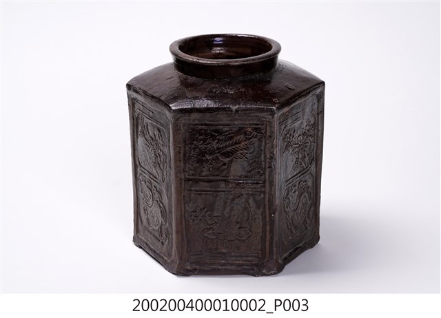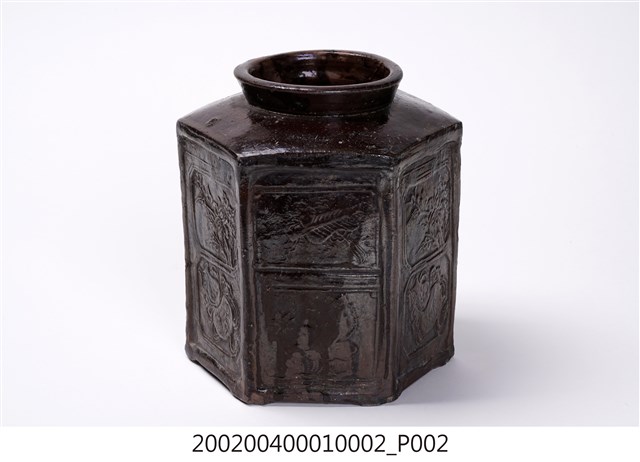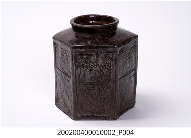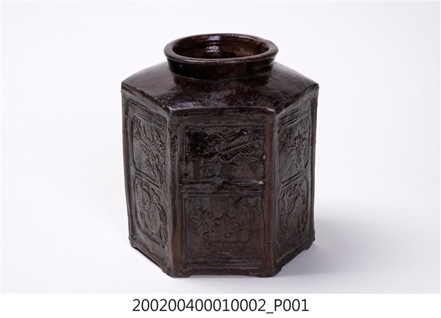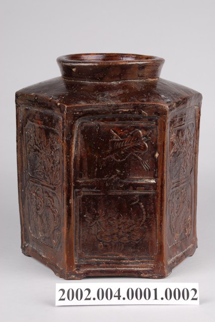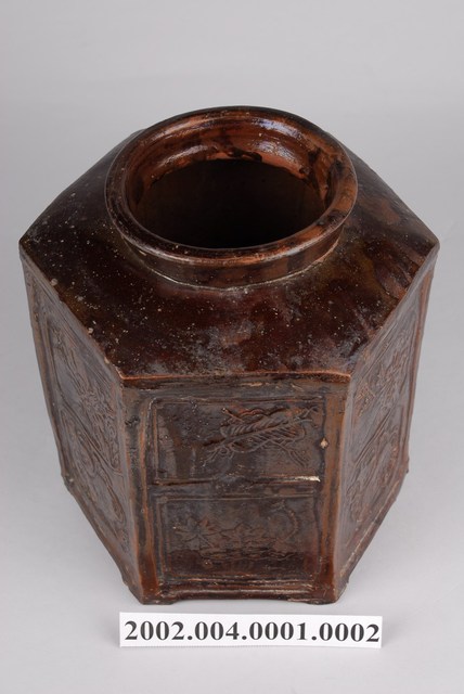 圓口,圓唇,口部寬大,頸部略向內縮小,折肩,直壁,器身為六角柱狀,肩腹交接處略微上凸呈圓弧狀,平底,六角各有一足。分上下兩等份,分別雕有花卉、蒲扇、葫蘆等紋樣。全器施深褐色釉,釉分布不均,可見釉料流下的痕跡。依器形和紋樣推測產地為中國廣東。