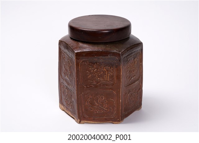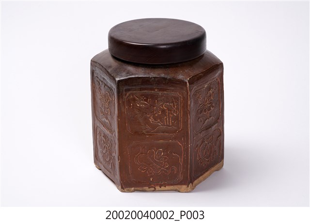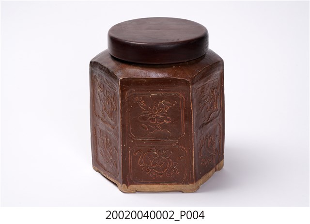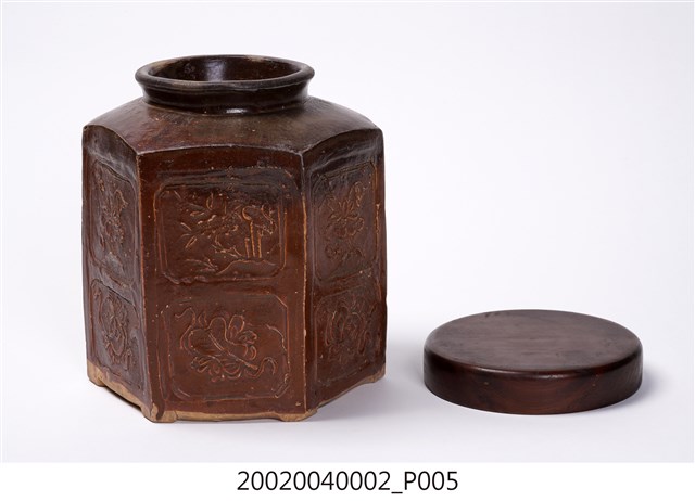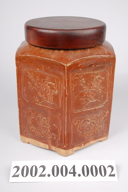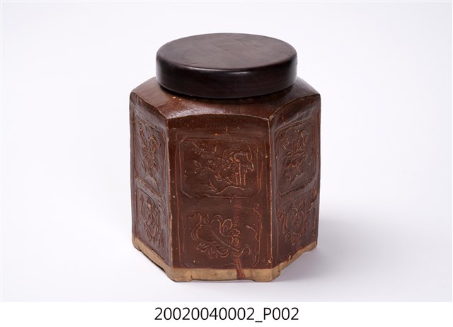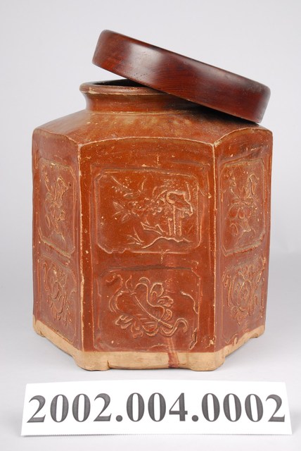 1.褐紅釉雕花六角茶葉甕,分成甕蓋、甕身二部分。甕身為六角形,形體偏小,施褐紅色釉,外器壁雕花,甕口覆蓋圓形木質蓋子,避免空氣進入。依器形和紋樣推測產地為中國廣東。2.此類陶器亦可稱為「陶罐」,陶罐的形制通常較陶甕小。此罐用來盛裝茶葉,也可稱為「茶葉罐」。