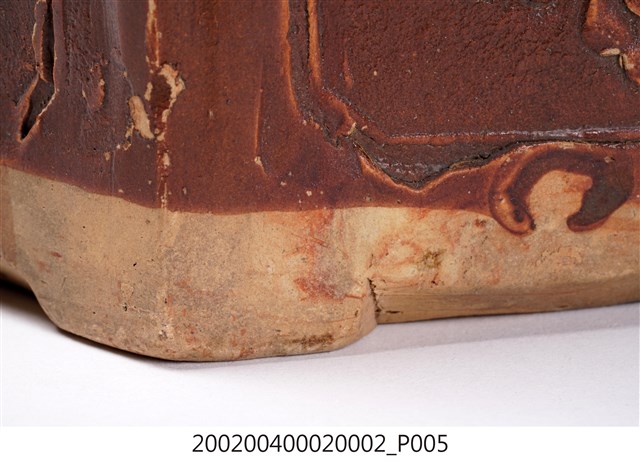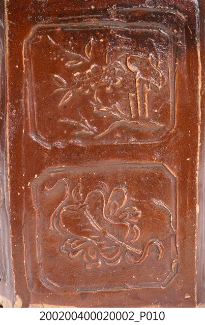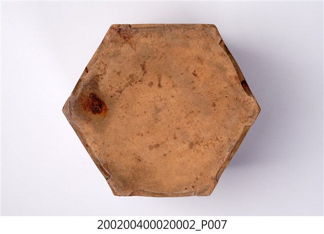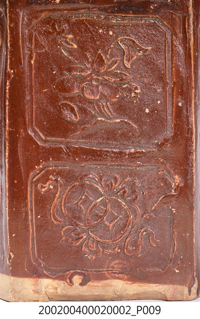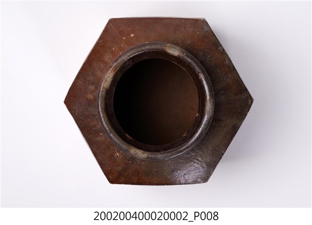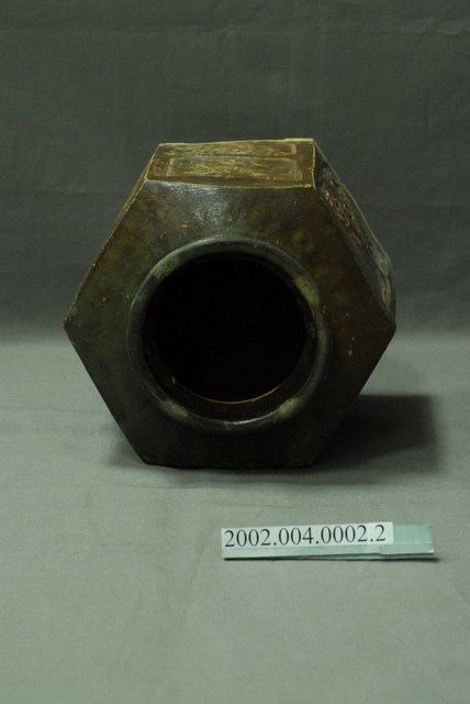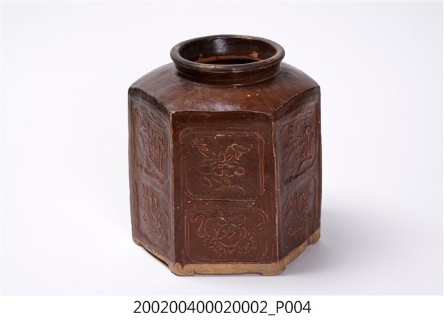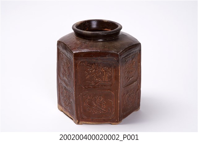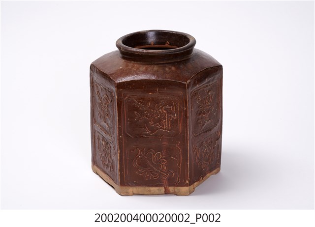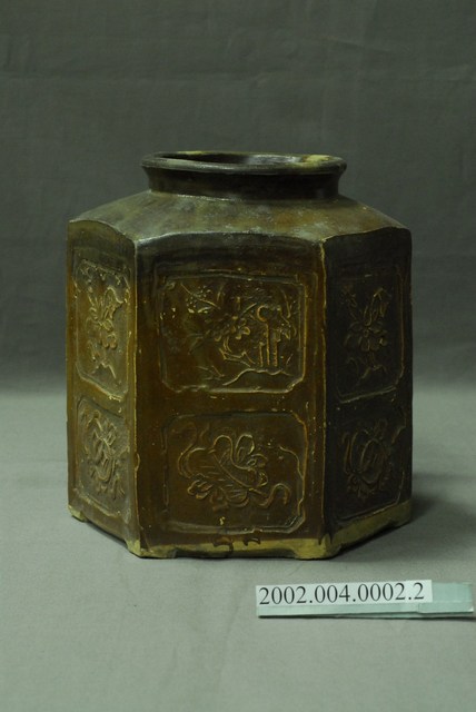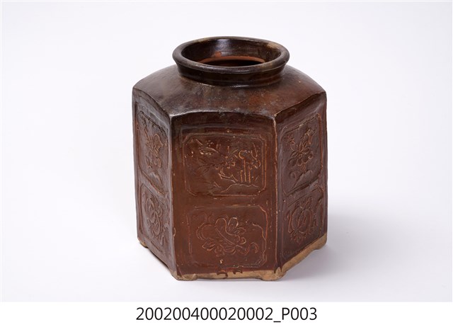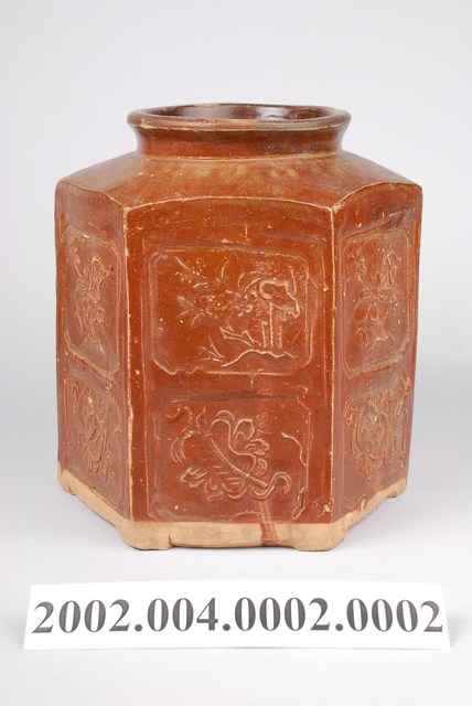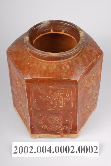 圓口,圓唇,口部寬大,頸部略向內縮小,折肩,直壁,器身為六角柱狀,肩腹交接處略微上凸呈圓弧狀,平底,六角各有一足。外器壁六個面分上下兩等份,分別雕有花卉、蒲扇、雙錢等紋樣。器口和外器壁施褐紅色釉,釉分布不均,底部無釉,呈淺磚紅胎色。依器形和紋樣推測產地為中國廣東。