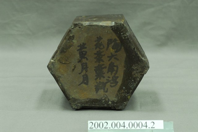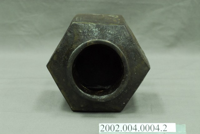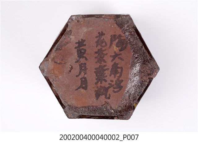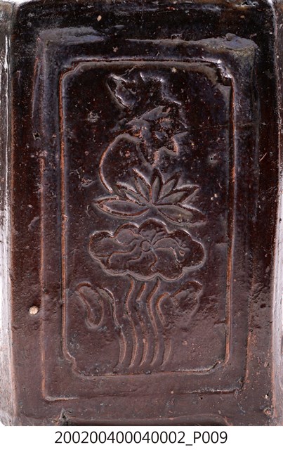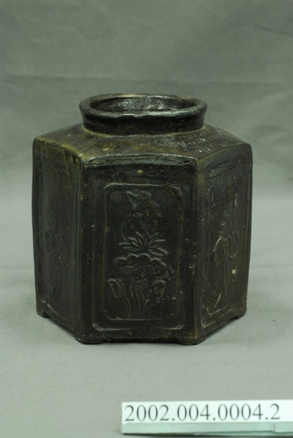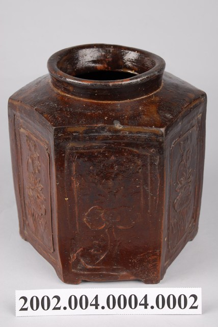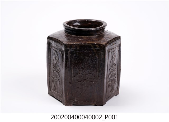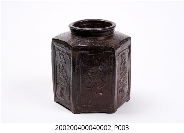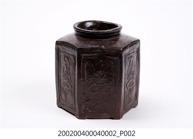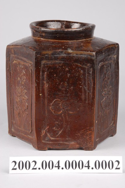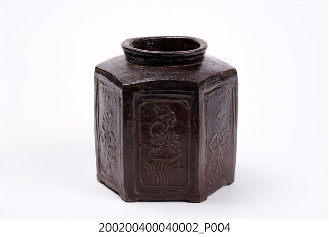 圓口,圓唇,口部寬大,頸部略向內縮小,折肩,直壁,器身為六角柱狀,肩腹交接處略微上凸呈圓弧狀,平底,六角各有一足。外器壁六個面分別雕刻不同的花卉紋樣,器口和外器壁施深褐色釉,釉分布不均,底部無釉,露出褐紅胎色,寫有「陶大角灣,花茶葉瓶,黃月月」的字樣,推測為此甕之產地與製造者之署名。