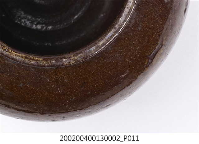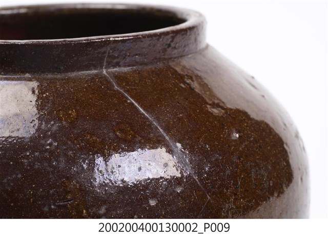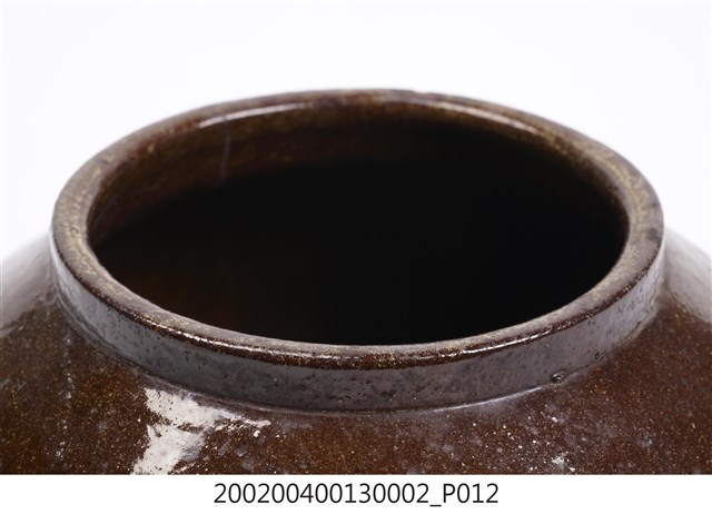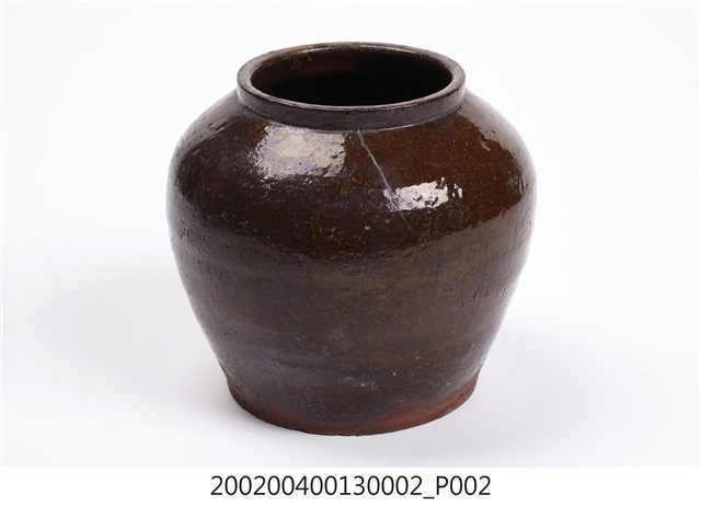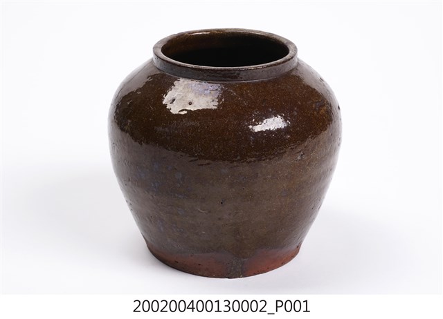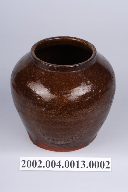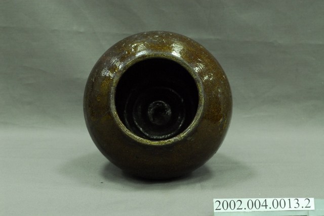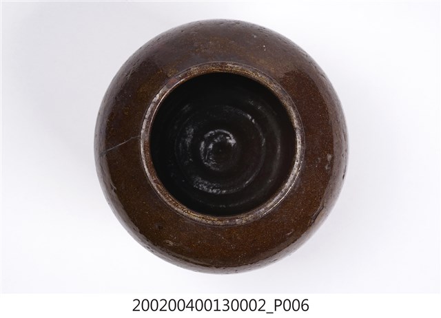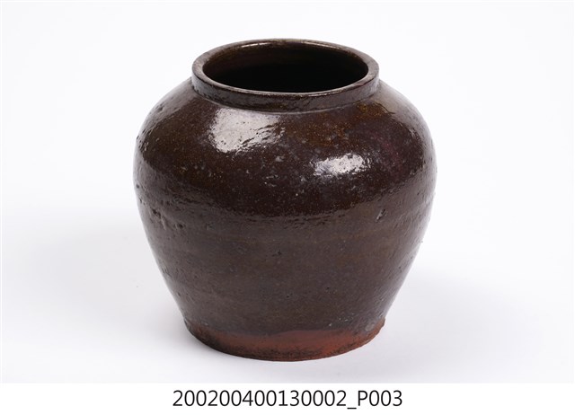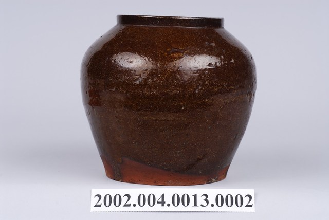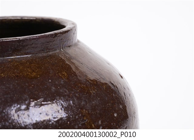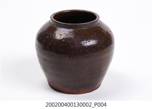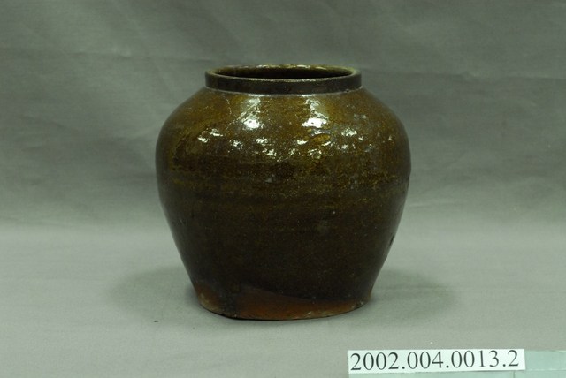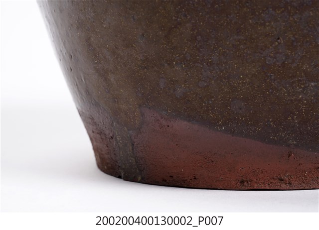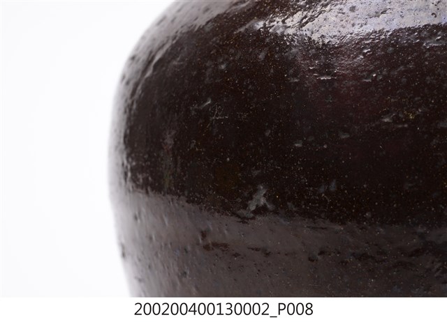 圓口,短直頸,肩部圓潤豐滿,器腹呈上寬下窄的弧形。形體偏小,高度與寬度相近,可用來裝酒,或油、鹽、糖等用量較少的日用品。全器保持素面無紋,施褐色釉,表面可見細小的灰白色斑點,釉不及底,胎色為褐紅色。
