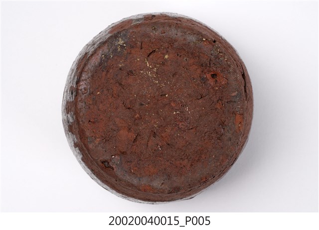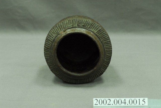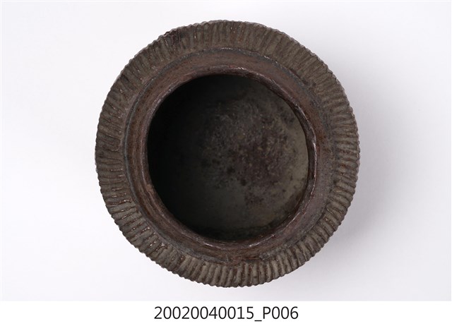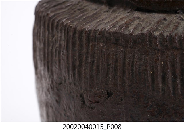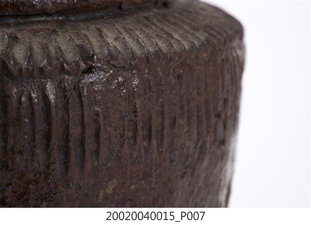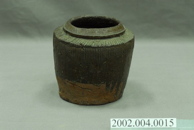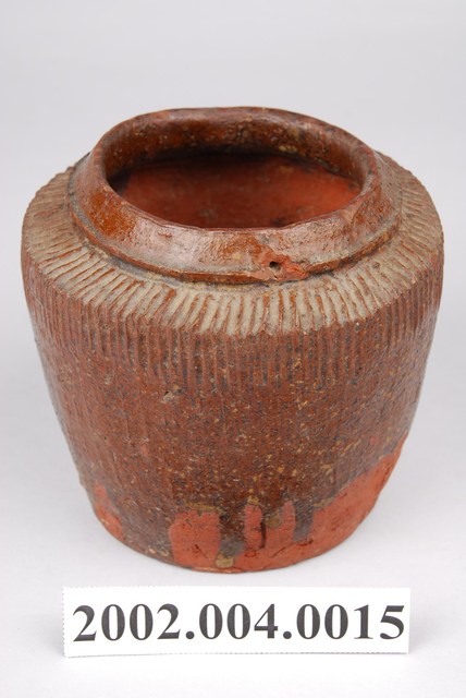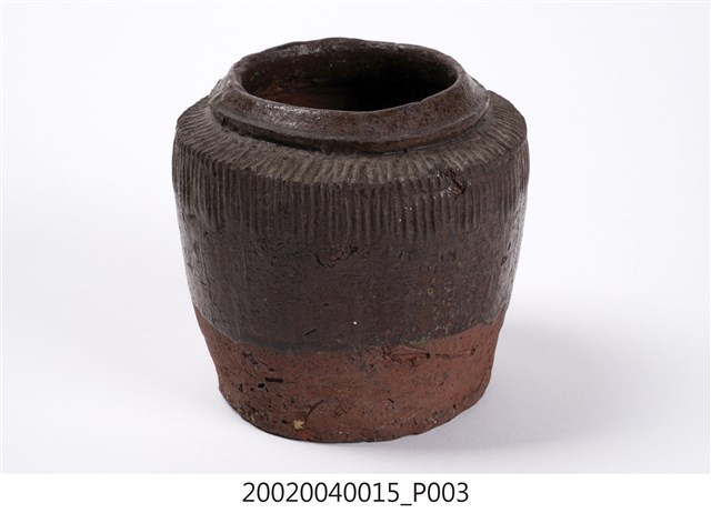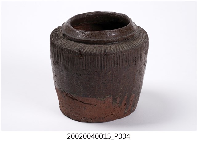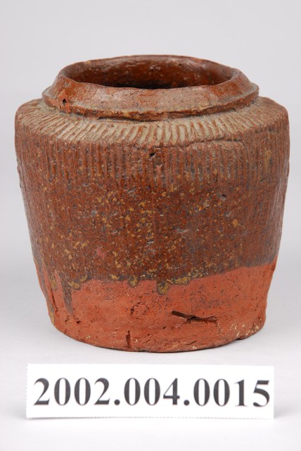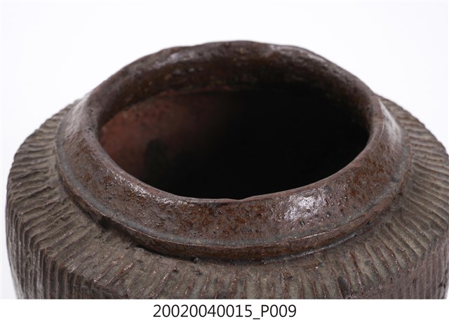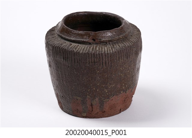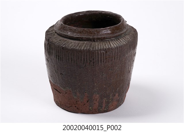 1.褐紅釉壓印直紋陶甕,圓口,折肩,直壁,平底,器身上寬下窄,整體呈倒梯形,頸部有一圈環形凸起,口向上內縮,可能為承接蓋子之用。外器壁肩部和腹部上半壓印細密的直線條紋,器口和外器壁施褐紅色釉,釉分布不均,底部露胎,胎色為磚紅色。做工粗糙,口部有一凹洞缺口,外器壁表面可見不平整的坑洞、凹痕,及釉料自上流下的痕跡。2.此類陶器亦可稱為「陶罐」,陶罐的器形與陶甕相似,形制較小,用途不定,通常用來盛裝油、鹽、糖等用量較少的日用品,常依其用途來命名,廣口的陶罐也適合用來醃漬醬菜或豆腐乳。