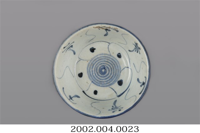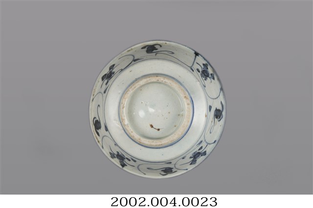 1. 青花纏枝靈芝紋撇口碗,由拉胚成形,施鈷料彩繪,高溫燒製而成。撇口,圓唇,斜直壁下收,底部方折,平底,底有圈足。全器施白釉,表面帶有氣孔,圈足底露胎,胎色米白。碗內外壁皆繪有青花纏枝靈芝紋,碗心飾螺旋紋,螺旋紋周圍綴以五個圓點,圈足飾以雙線環狀紋,唇部以青花塗滿,一側釉色略有剝落。2. 纏枝紋是由枝蔓、葉子、與主要花卉搭配組合而成的紋飾,是中國青花瓷器常見的裝飾題材。