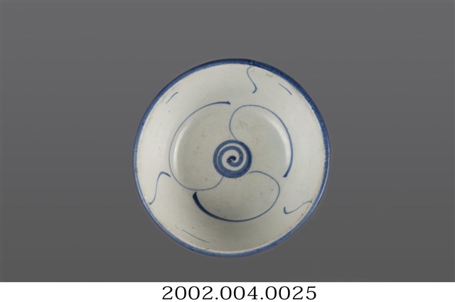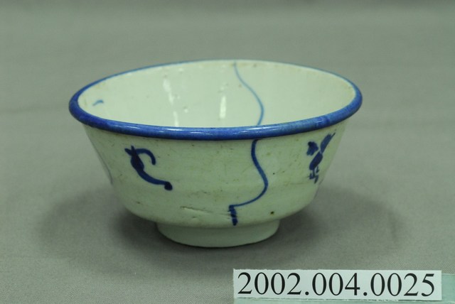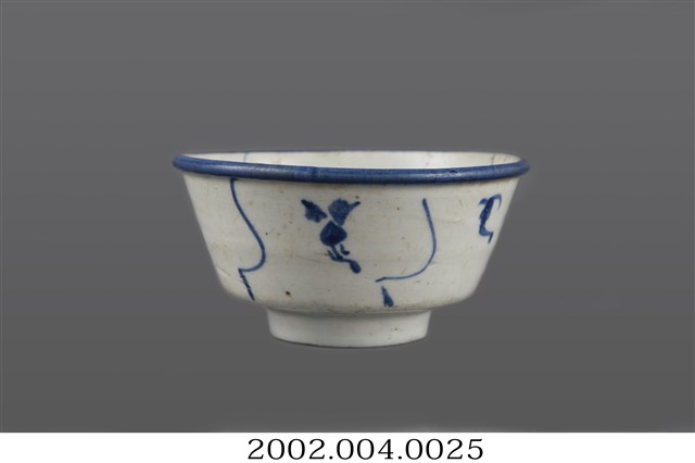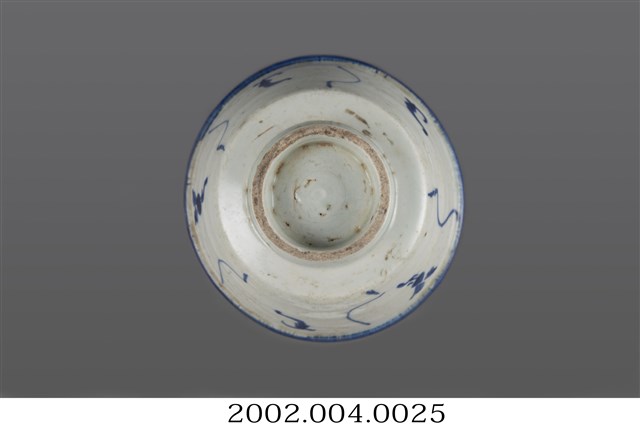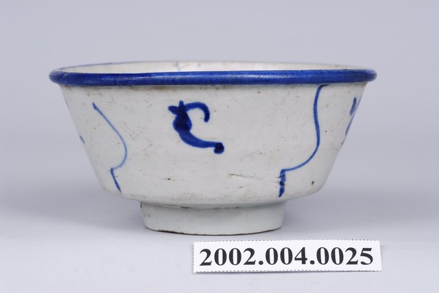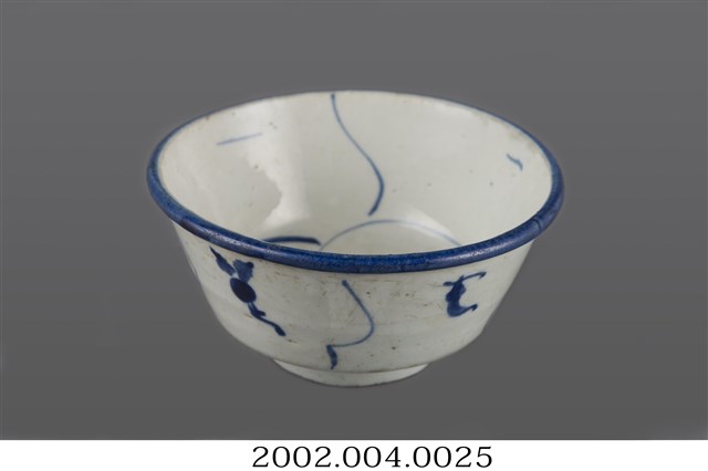 1. 青花纏枝靈芝紋撇口碗,由拉胚成形,施鈷料彩繪,高溫燒製而成。撇口,圓唇,斜直壁下收,底部方折,平底,底有圈足。全器施白釉,圈足底露胎,胎色灰褐,碗底可見明顯氣孔。碗內壁僅以簡單幾筆青花線條裝飾,碗心繪一小圈螺旋紋,碗外壁繪有青花線條與靈芝紋樣,唇部以青花塗滿。相較於一般的青花纏枝靈芝紋,此碗的紋樣裝飾相當簡單。2. 纏枝紋是由枝蔓、葉子、與主要花卉搭配組合而成的紋飾,是中國青花瓷器常見的裝飾題材。