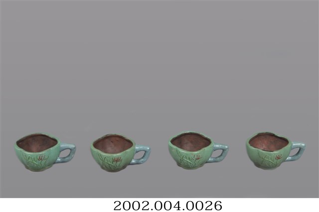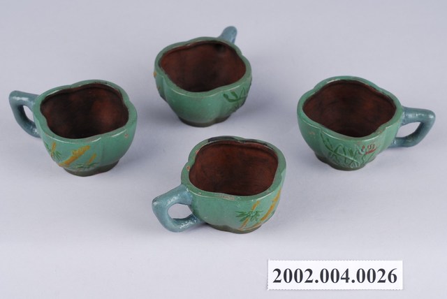 1.本件文物組含一組四件造型相同的陶製小茶杯,茶杯為四瓣葵口造型,有圈足,杯身厚實,一側有環型把手,做為造型點缀,亦有防燙手之作用。杯子內壁呈現陶土原色,外壁則佈綠釉,杯腹上浮雕彩繪花草竹紋作為紋飾,相當樸質可愛。2.1960~70年代由於臺灣經濟好轉,以及政府提倡飲茶,茶藝在臺灣開始蔚為風尚,清代流行於閩粵之間的小茶壺搭配小茶杯組,因茶藝流行而被大眾普遍使用。鶯歌早期只生產較粗糙供農人使用的大型茶壺,當茶藝盛行後,鶯歌窯業業者才紛紛投入製造小型茶具組的行列。