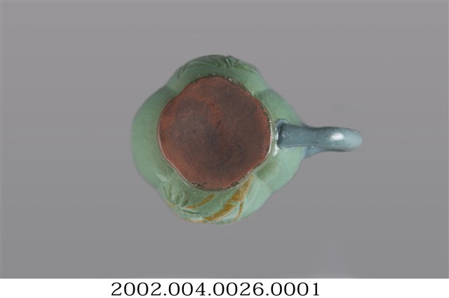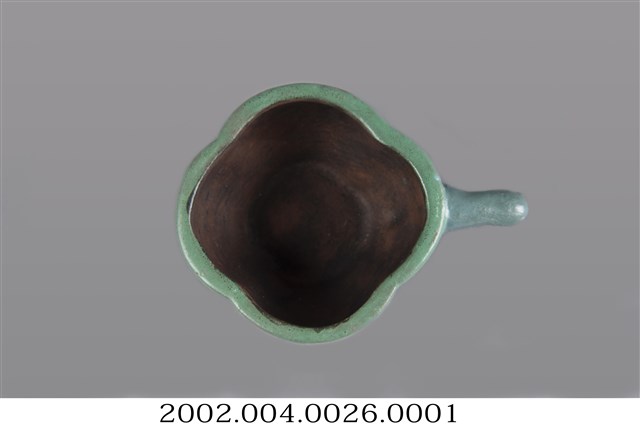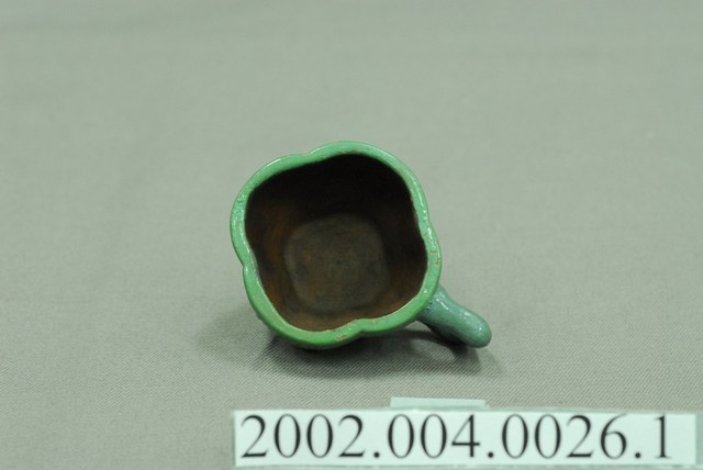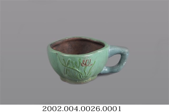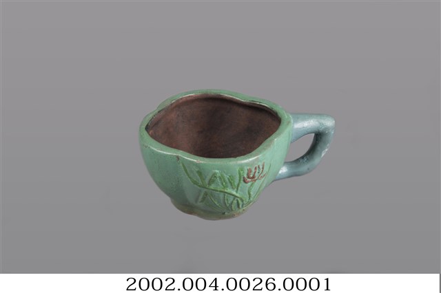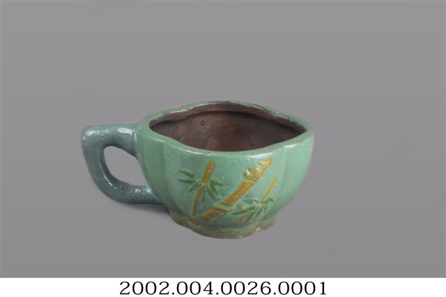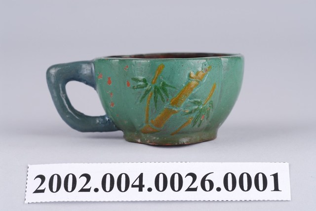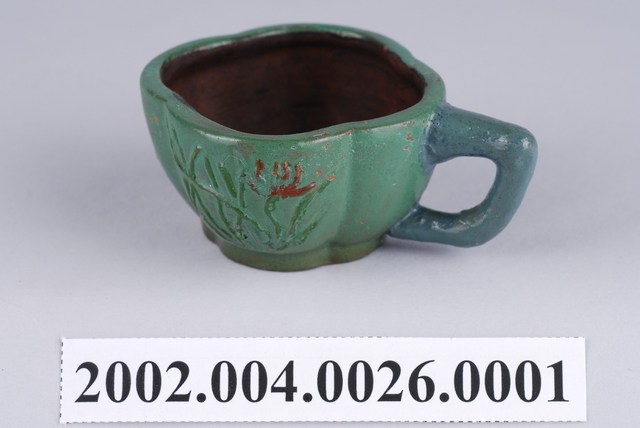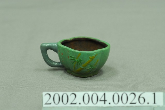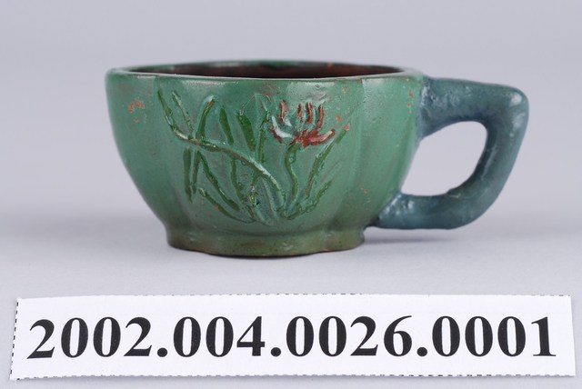 1.本件為陶製綠釉彩繪花草紋小茶杯組中的四件陶製小茶杯之一,茶杯以注漿法製成,為四瓣葵口造型,有圈足,杯身厚實,一側有環型把手,做為造型點缀,亦有防燙手之作用。杯子內壁呈現陶土原色,外壁除了底部佈滿綠釉,然佈釉不均,部分露出胎體,有顆粒、氣泡現象,杯腹則有浮雕彩繪花草竹紋作為紋飾,相當樸質可愛。2.1960~70年代由於臺灣經濟好轉,以及政府提倡飲茶,茶藝在臺灣開始蔚為風尚,清代流行於閩粵之間的小茶壺搭配小茶杯組,因茶藝流行而被大眾普遍使用。鶯歌早期只生產較粗糙供農人使用的大型茶壺,當茶藝盛行後,鶯歌窯